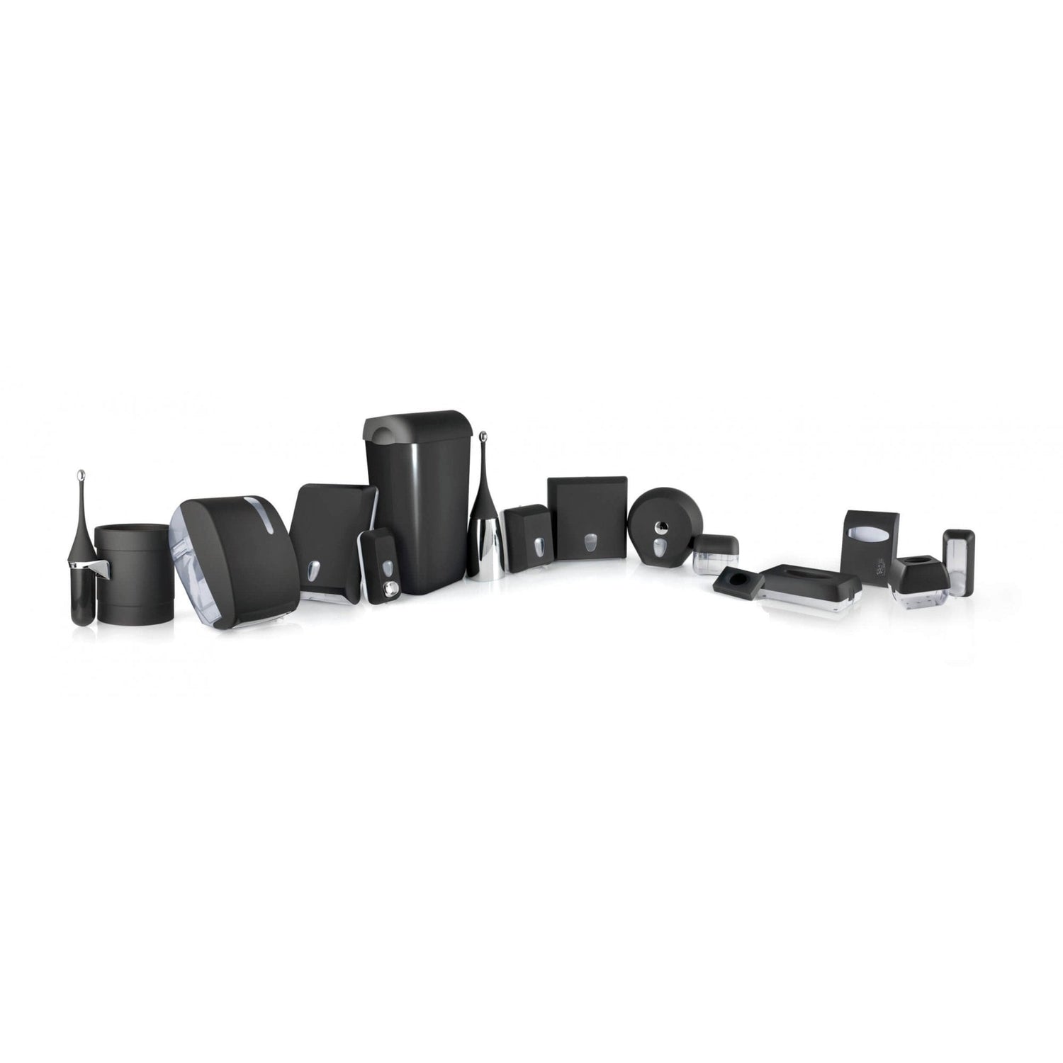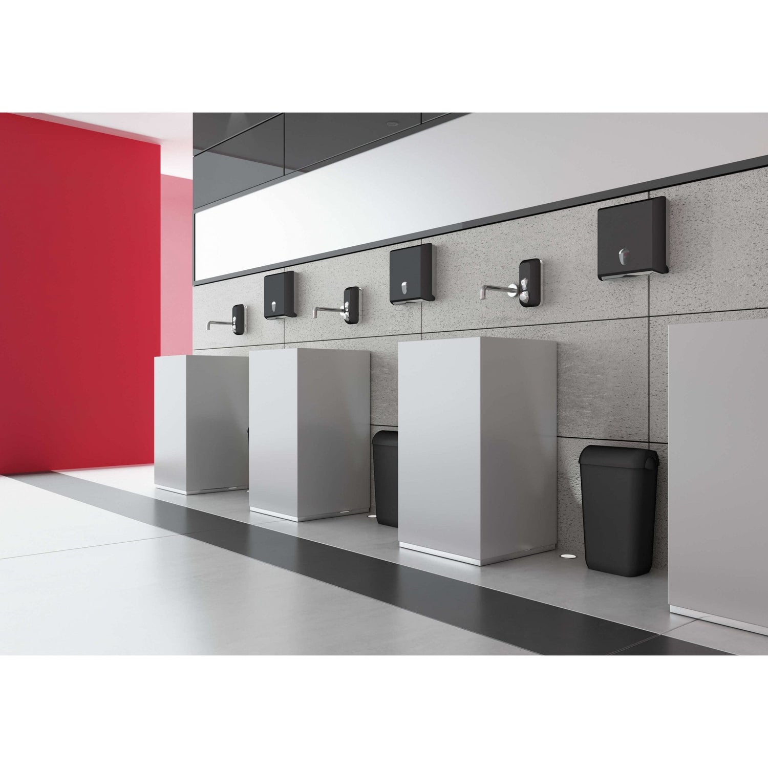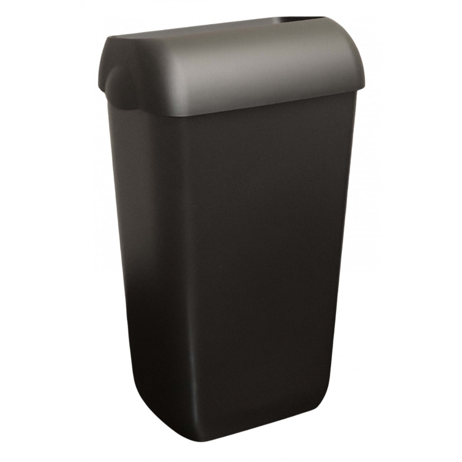 742 waste bin for commercial bathrooms can floor stand or be wall mounted thanks to the wall supports and anchors included. With a capacity of 23 litres, this durable plastic receptacle will match the colour of the Soft Touch range of washroom accessories available not only in black but also in other five finishes (blue, green, brown, orange and white).