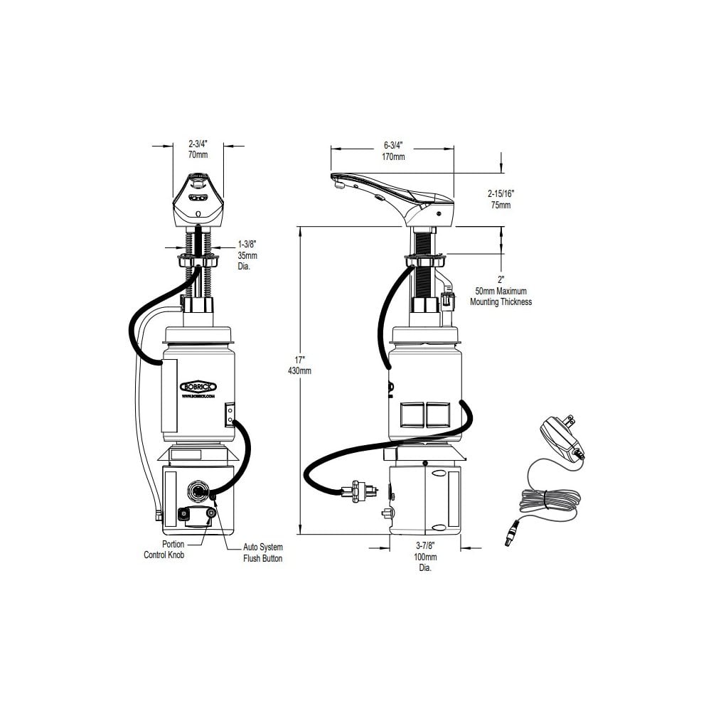 840/842 is a deck mounted automatic soap dispenser from Bobrick with 2 finishes available, matte black or polished brass. This soap dispenser uses Foam soap and is bulk fill, boasting a large capacity of 1000ml, making for an ideal installation in high traffic areas with less refilling required. The spout is crafted from die cast zinc, which is housed in a durable ABS plastic, ensuring the pumps longevity and strength. An adjustable volume of soap per pump allows for savings to be made, with a potential for 1000ml of soap to last over 7 times as long! A defined activation range eliminates the chance of false activation. A 6V AC adapter comes included.
