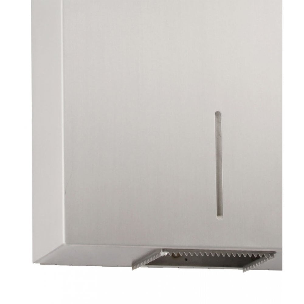 Viewing slot in door reveals the amount of toilet tissue on roll. Unit is designed for quick reloading.