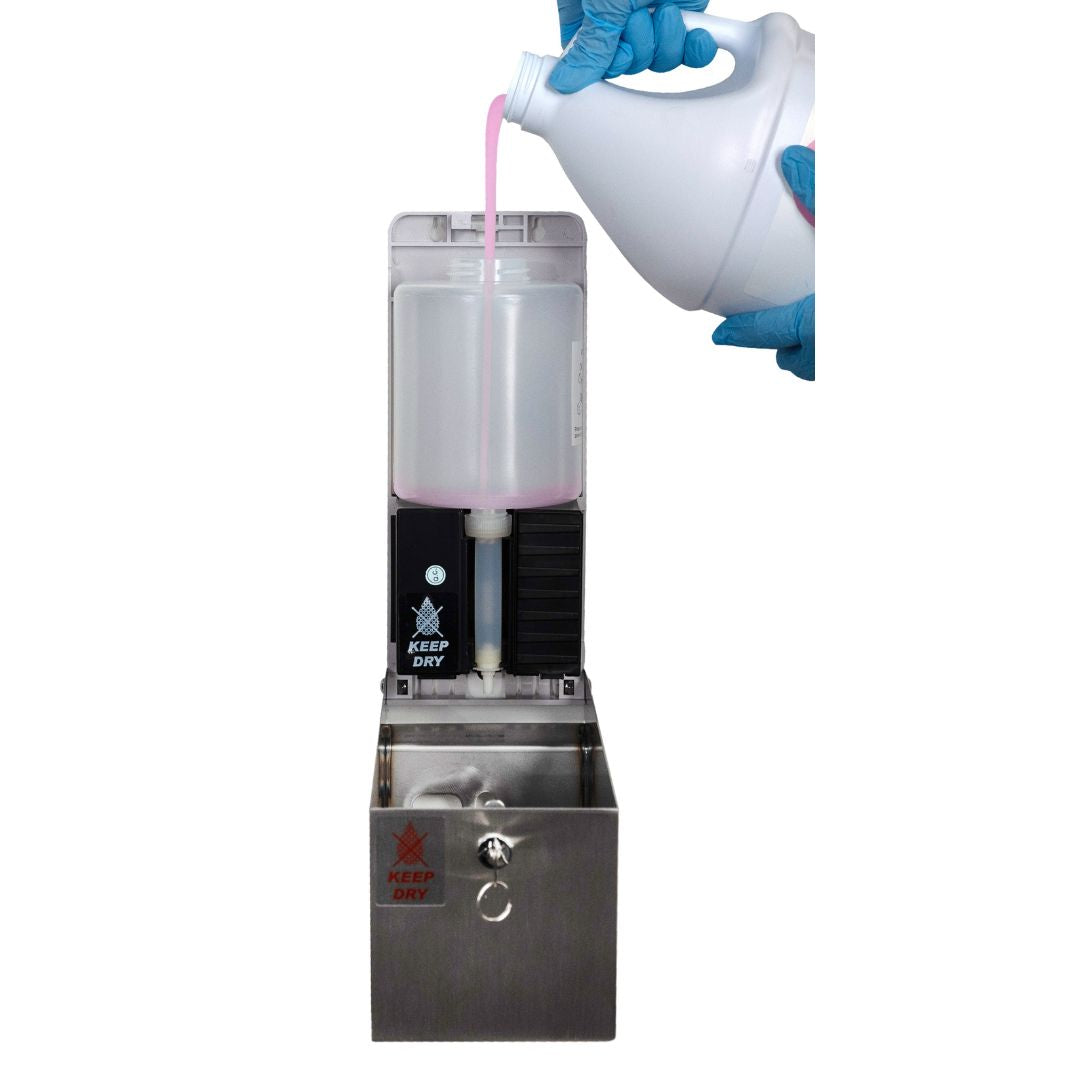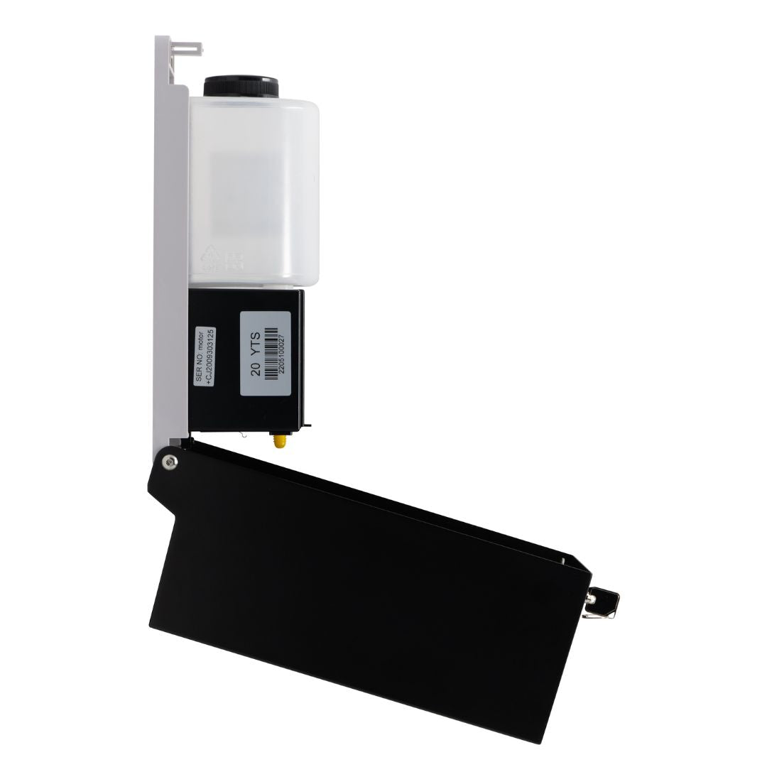 B-2012 dispenses 1 ml after detecting a hand on a 60mm area for approximately one second. Its 850ml reservoir can be refilled by opening the top lid with a special key (provided).