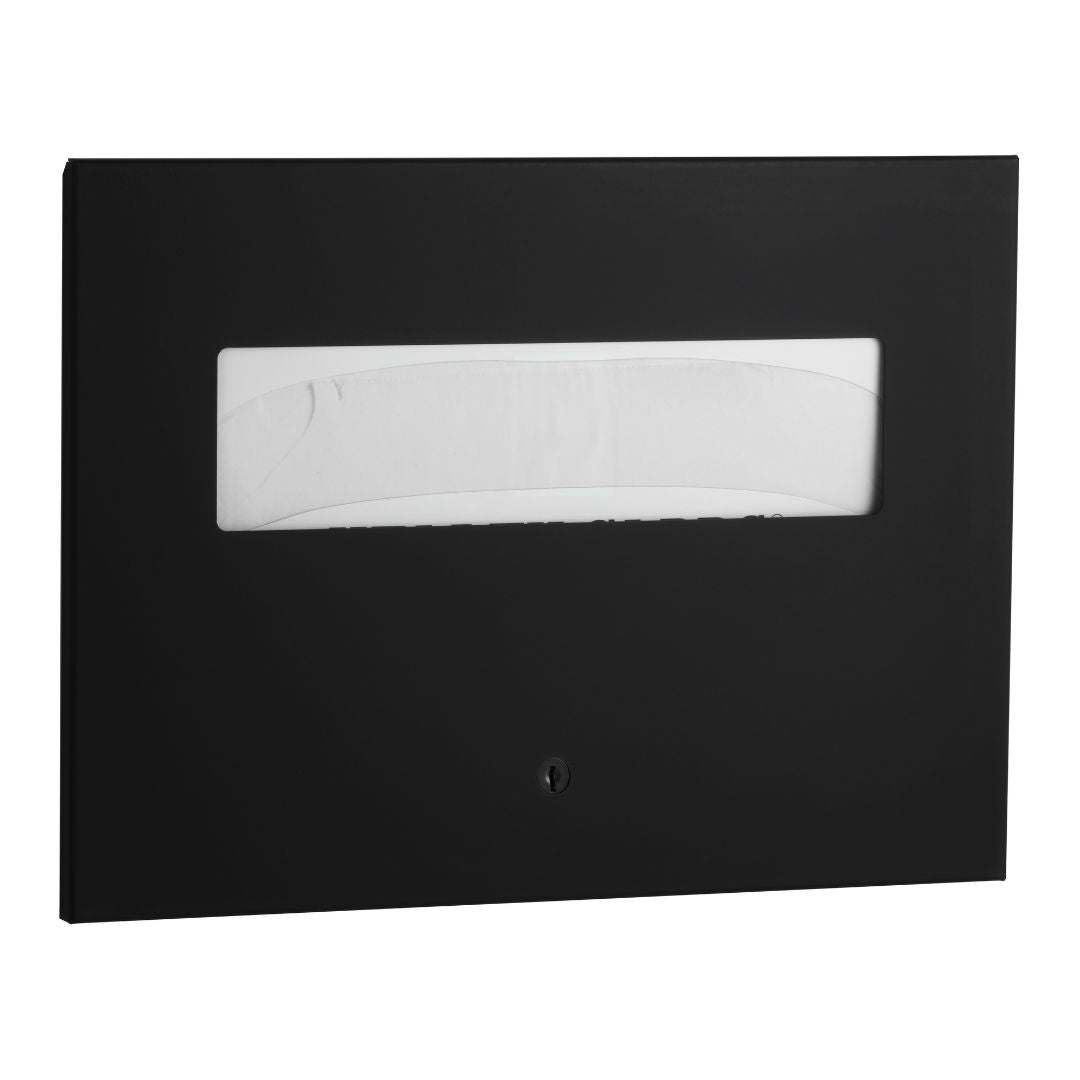 Dispenses single or half-fold paper toilet seat covers. To fill dispenser, door unlocks with key provided. Capacity: 500 toilet seat covers.