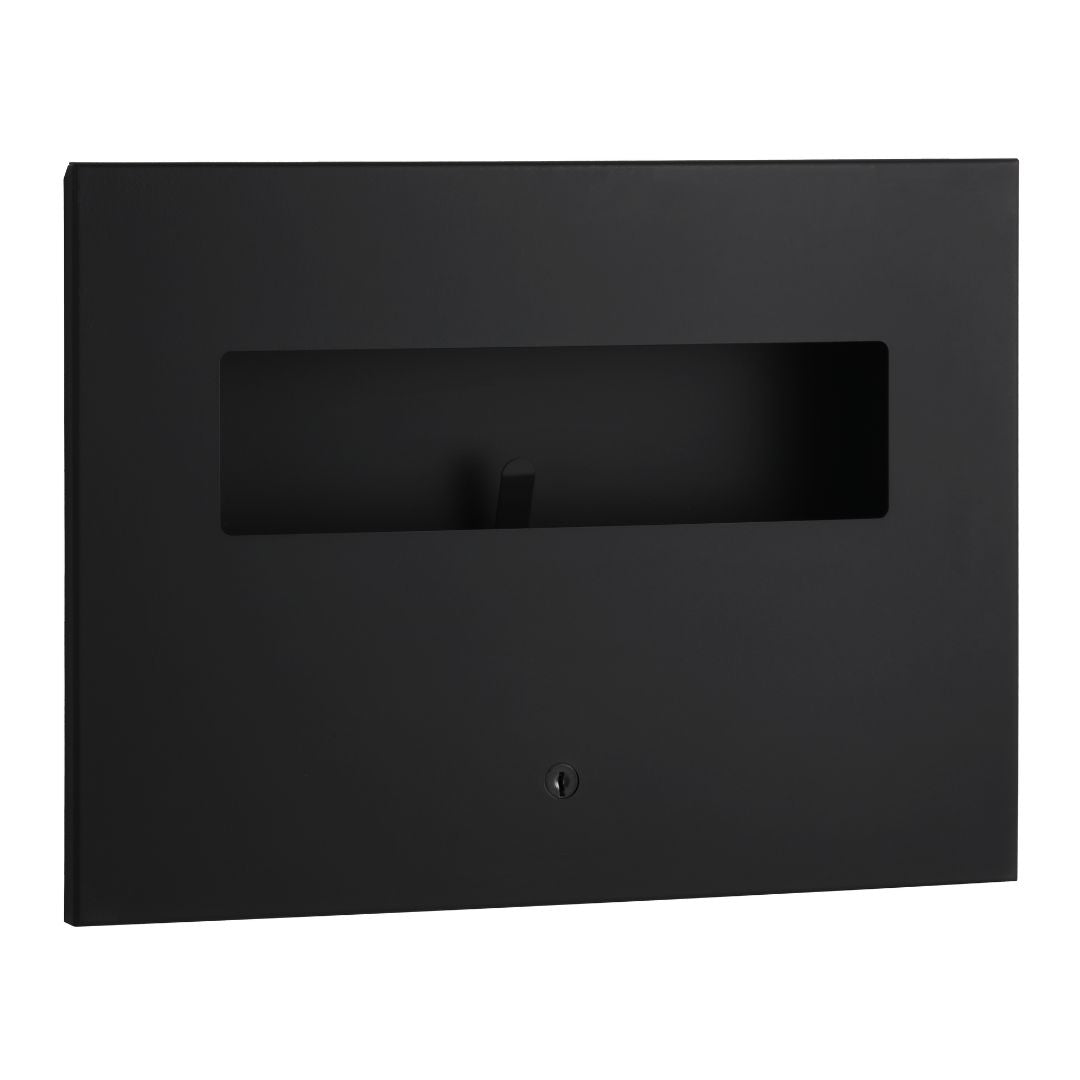 Recessed toilet-seat-cover dispenser shall be Type-304 stainless steel with all-welded construction; exposed surfaces shall have satin finish or matte black, as specified. Door shall be 18 gauge (1.2mm); have 14mm 90° return edges; be secured to cabinet with a concealed, full-length stainless steel piano-hinge. Equipped with a tumbler lock keyed like other Bobrick washroom accessories. Tumbler lock flush with the door - no protrusion. Dispenser shall have a minimum capacity of 500 paper toilet seat covers.