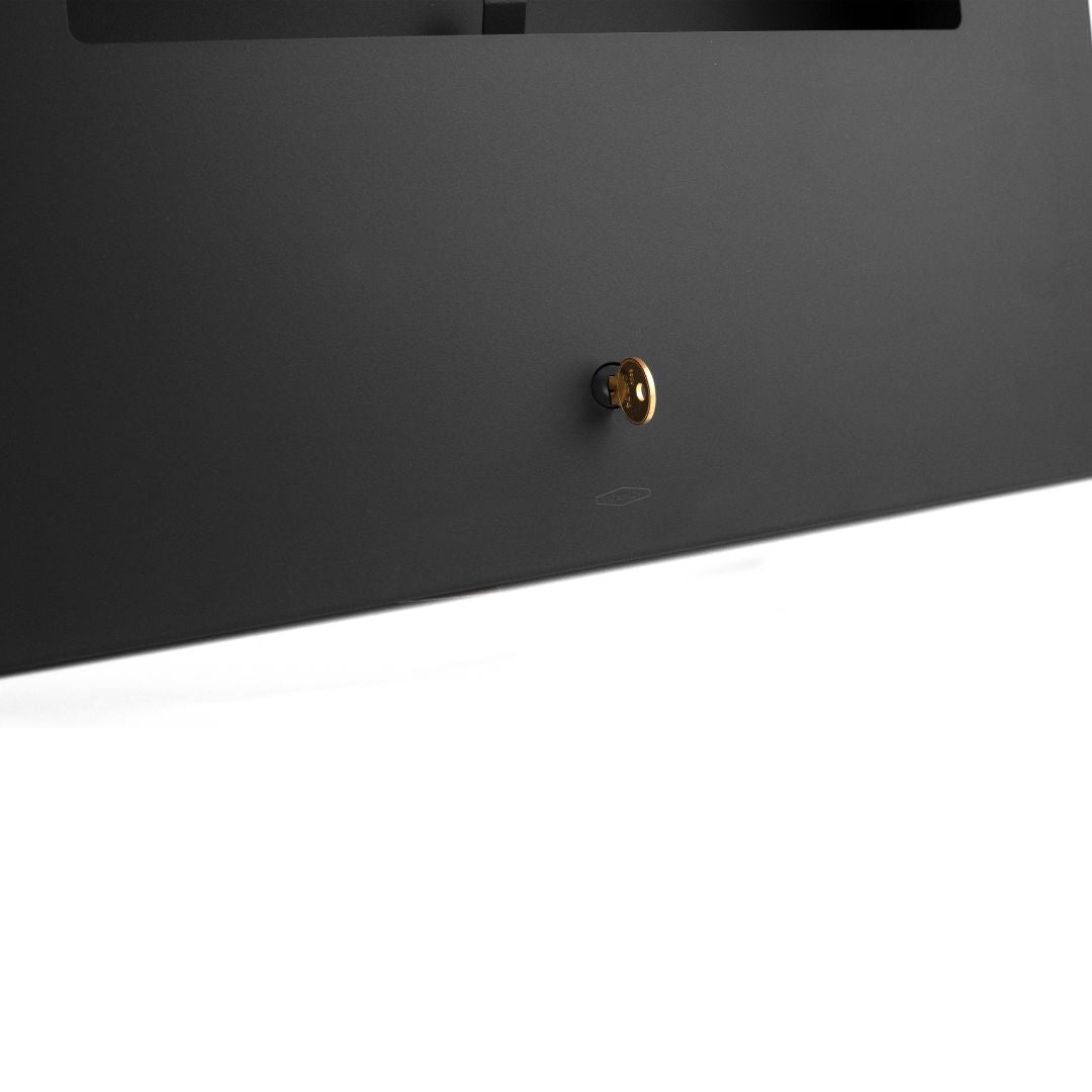 - Door — 18-8, Type-304, 18-gauge (1.2mm) stainless steel with satin finish or matte black, as specified. 14mm 90° return for maximum rigidity. Secured to cabinet with a concealed, full-length stainless steel piano-hinge. Equipped with a tumbler lock keyed like other Bobrick washroom accessories. Tumbler lock flush with the door - no protrusion.