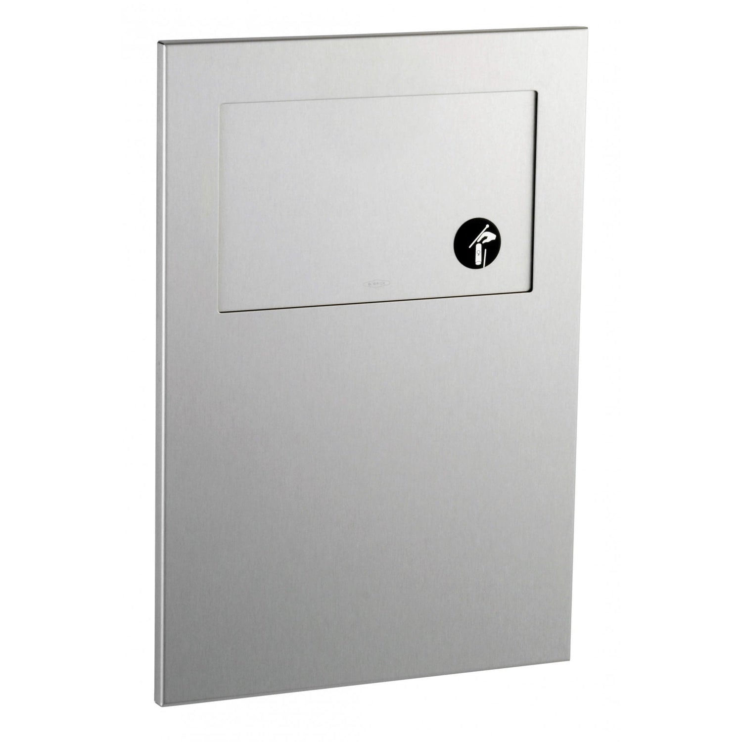 Bobrick B-35303 recessed satin stainless steel sanitary bin is a hard-wearing sleek unit for waste disposal composed by an all-welded cabinet, robust door with 90º return, hinged panel that self-closes and a removable 4.6 litre receptacle made of leak-proof rigid plastic.