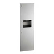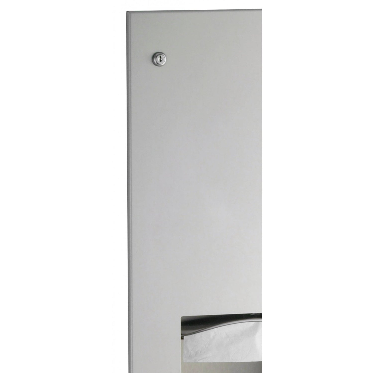 Bobrick B-39003 recessed combination unit is composed by one high capacity hand paper towel dispenser with hemmed opening to prevent from paper tearing and one removable leak-proof 45L waste bin. The 90º degree angles of this TrimLineSeries 2-in-1 fits the simple design of minimalism. To guarantee durability, all parts except the plastic container are made of 304 stainless steel with a long-lasting brushed satin. This item integrates two tumbler locks in order to discourage vandalism and a door-swing limiter so that there is no damage on surrounding accessories when servicing. The built-in adaptor tabs of the paper towel dispenser only need to be repositioned in one of the six slots available in order to adjust to accommodate C-Fold, Z-Fold or singlefod sheets. The additional accessory TowelMate® 30903-130 would permit to improve the dispensing by ensuring only one sheet is given at time and without bulging or sagging.