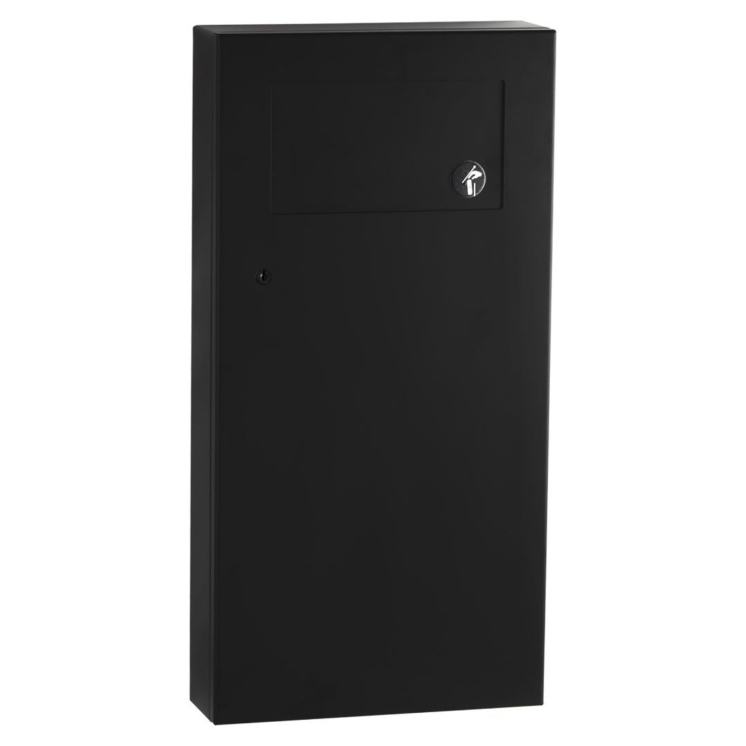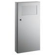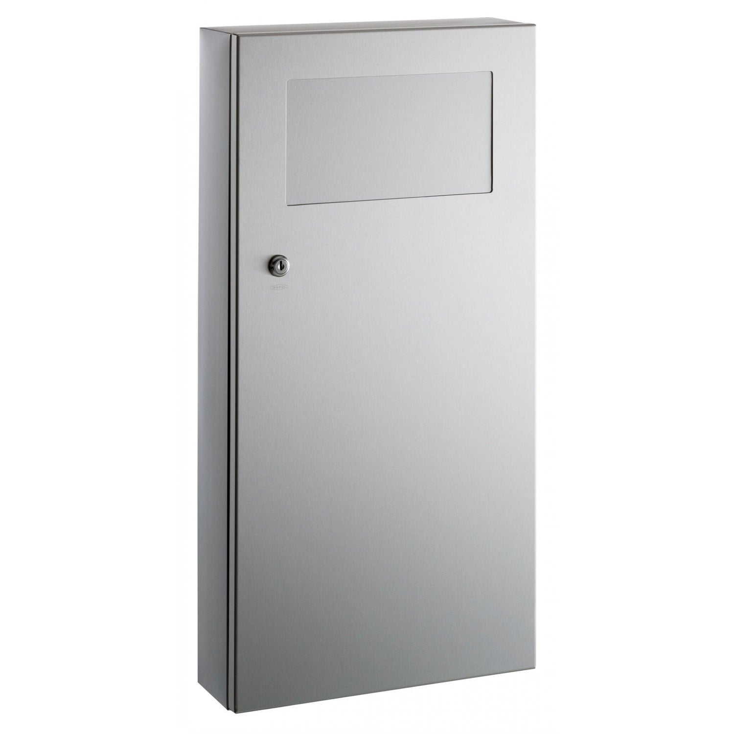 With the distinctive 90º angles of the minimalist TrimLineSeries, Bobrick B-35639 waste bin is composed by an all-welded cabinet, tumbler keyed door with cable swing limiter, removable 11L receptacle and self-closing push lid with a universal graphic symbol that allows easy disposal whilst concealing odours. Its stainless steel manufacture ensures a long life of the product, if properly maintained; the brushed satin finish typical of contemporary washrooms and toilet cubicles is smooth and hard-wearing.