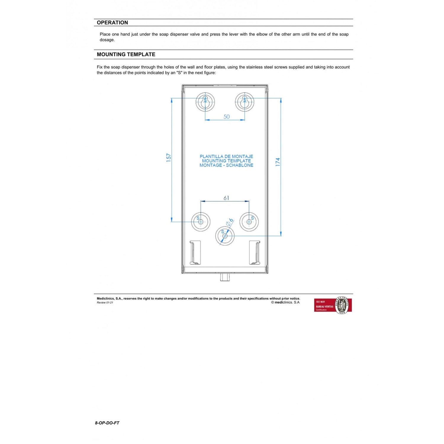 Compatible hand sanitiser refills: GA70 (alcohol gel); IFS2PK074101 (alcohol free). This is an attractive stainless steel, lever operated 1.5l capacity soap dispenser, suitable to give 1.5ml shots of liquid soaps or hydro-alcoholic gel. Surgical soaps and soaps with solid abrasive particles are not supported. Lever operation allows the user to dispense the soap with their elbow, limiting cross contamination. Robust and vandal resistant it includes a 0.8mm thick cover, stainless steel lever and is suitable for wall mounting in high traffic locations.