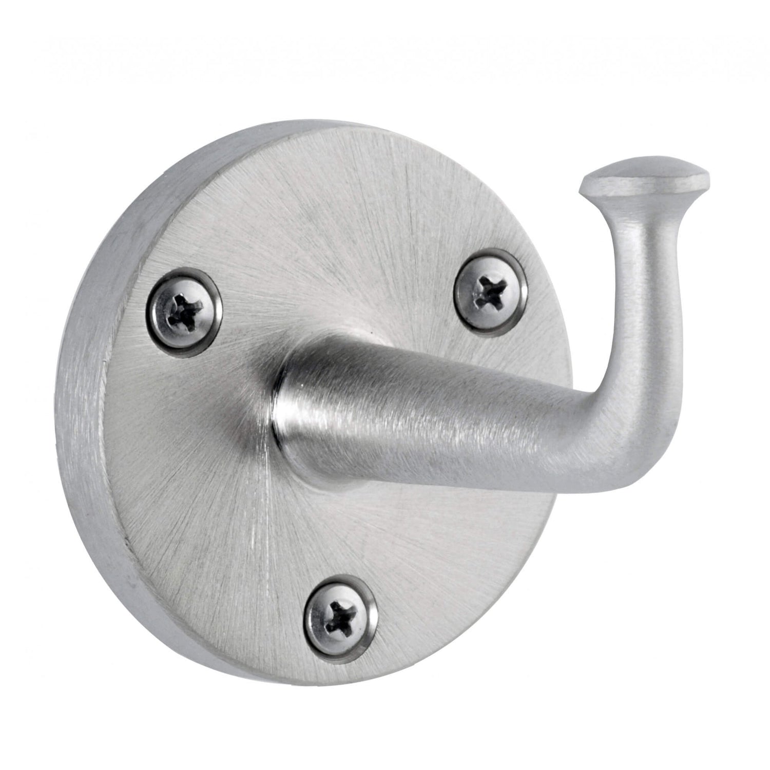 - Bobrick B-211 heavy duty coat hook with exposed fixings and a brushed satin finish.
