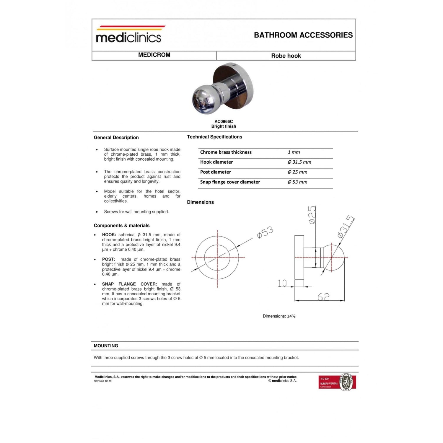 Mediclinics Chrome Plated Brass Hook