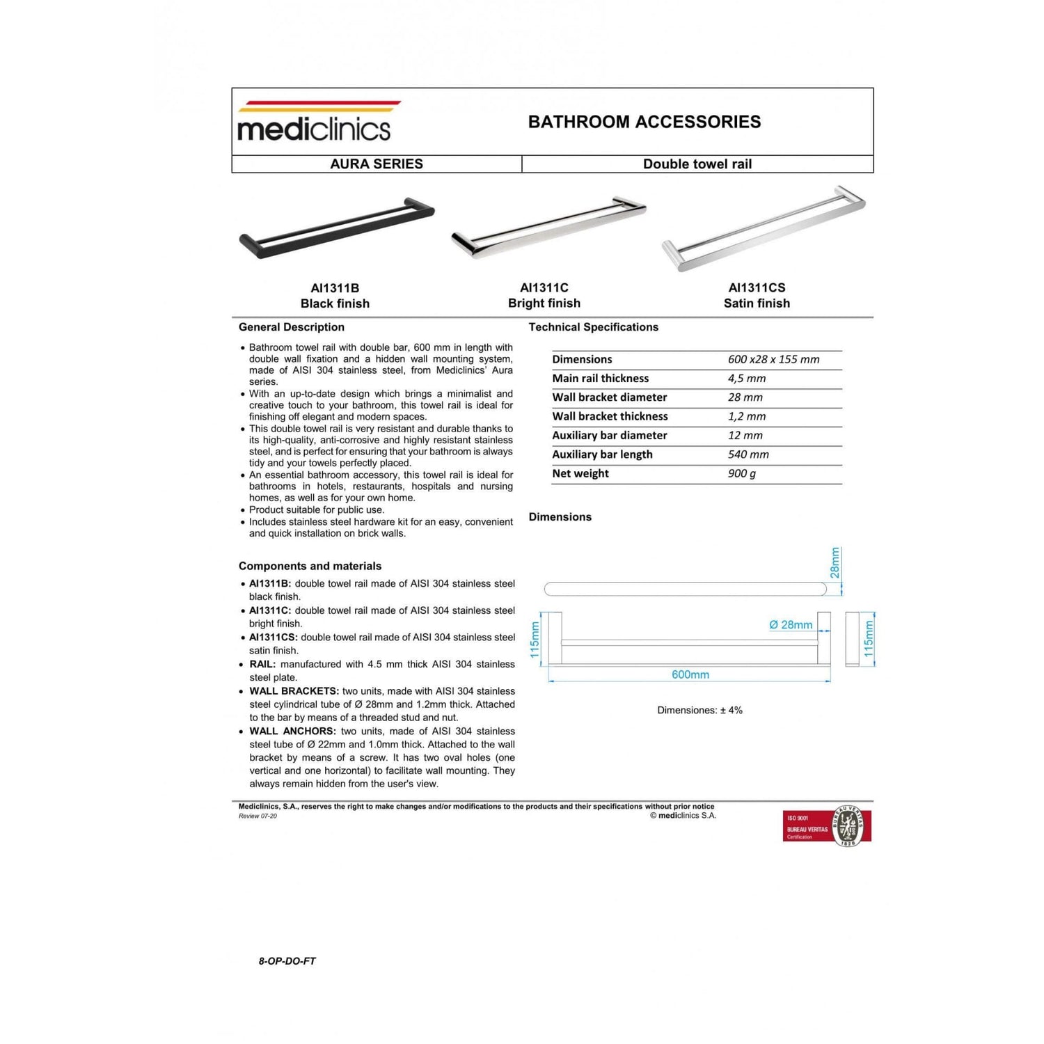 The straight double towel rail is perfect for all public or private bathrooms with a sleek and elegant design. Made from stainless steel this rail features a hidden wall mount design and is very durable being anti-corrosive and highly resistant. This 600mm rail is double mounted and the hardware for the installation is provided.