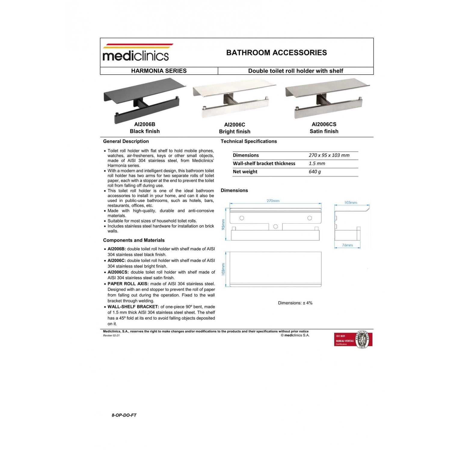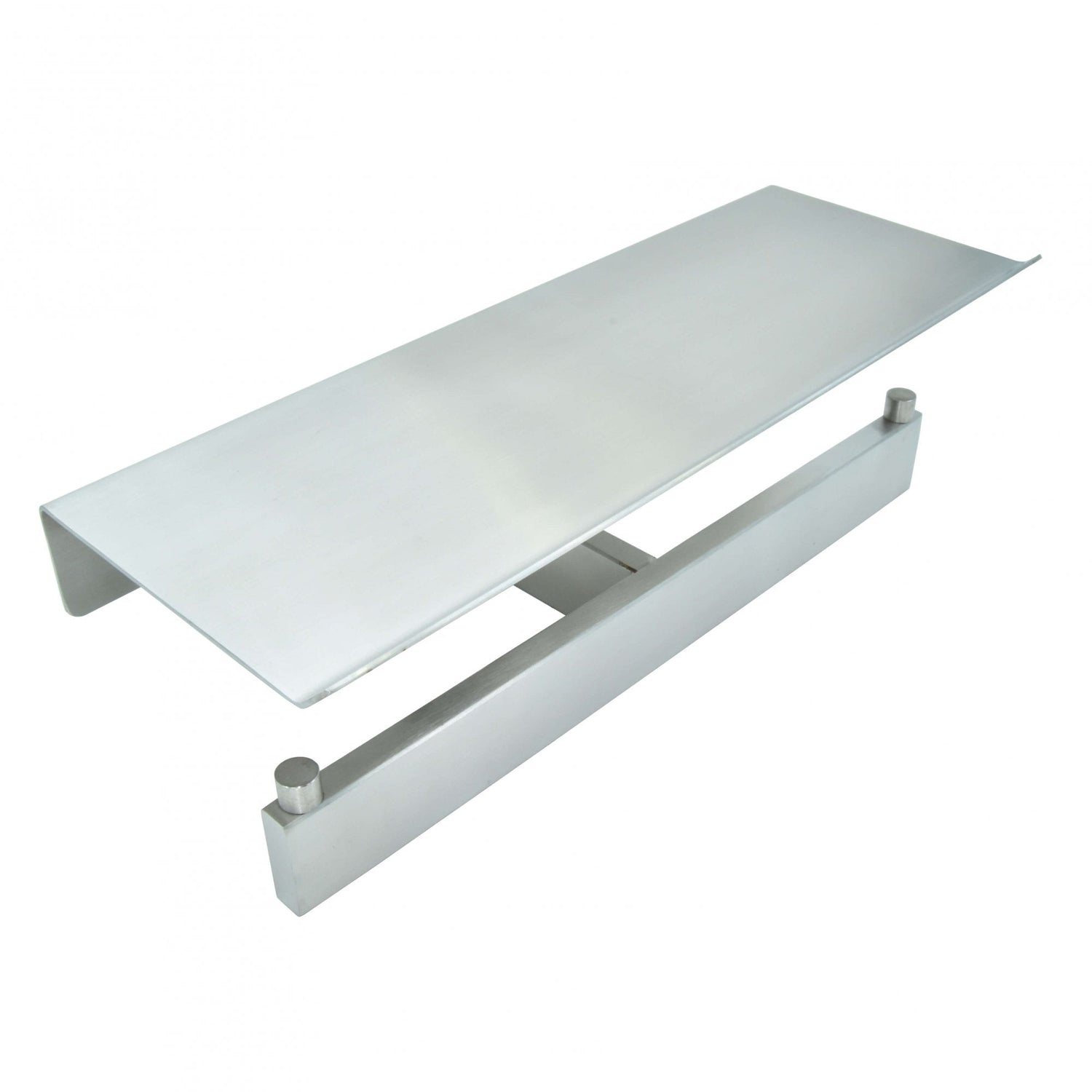 The wall mounted Double Toilet Paper Roll Holder with Shelf is suitable for any private or public location with a handy shelf unit to store small items such as keys or phones. The holder has a stopper to ensure that rolls do not fall off and hardware for the wall installation is provided. Very durable with anti-corrosiveness properties and a hidden wall mounting system.