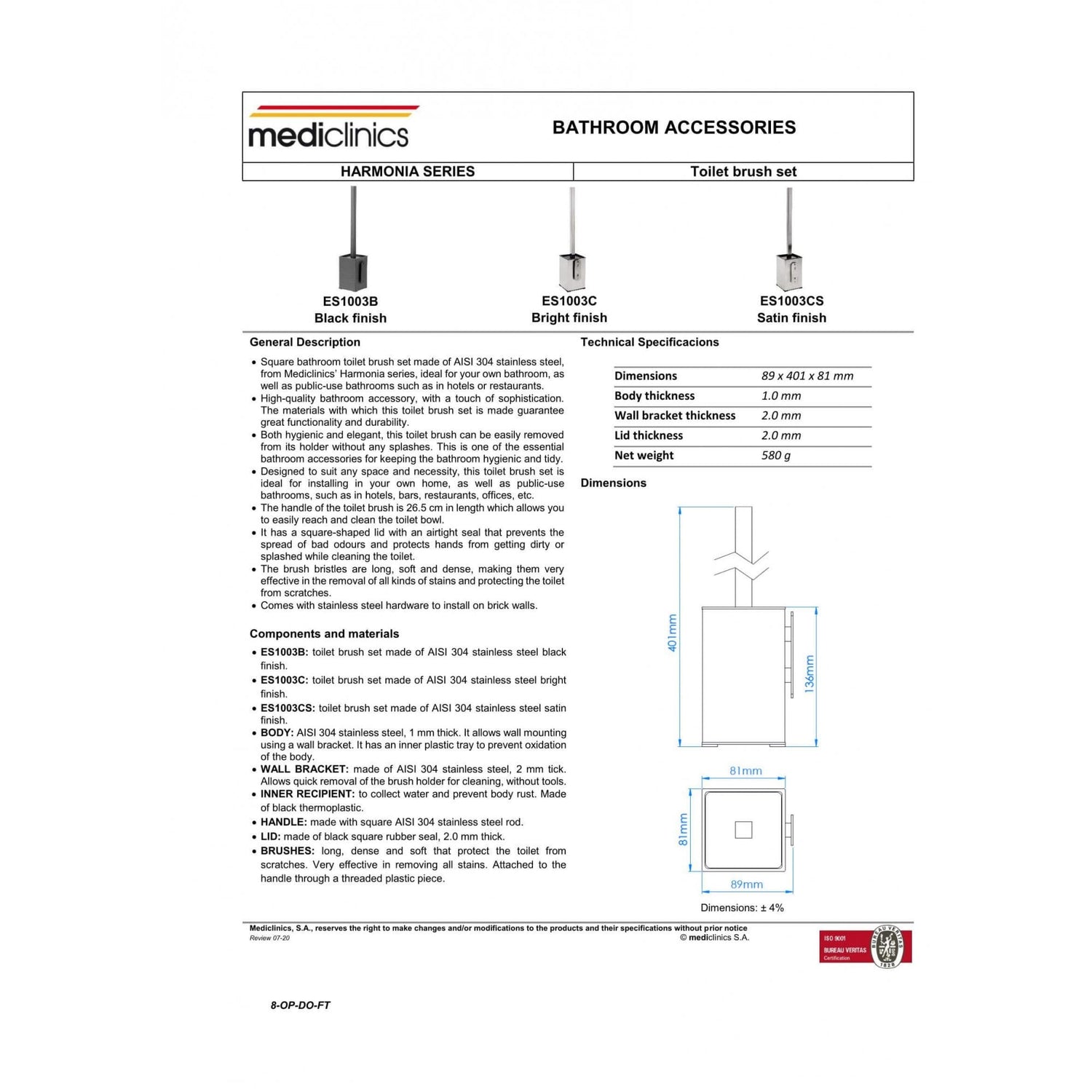 A stylish and easy to install product, the ES1003 Square Toilet Brush Holder made of AISI 304 Stainless Steel is resistant to humidity and corrosion. Being an easy to clean and hygienic brush, it is perfect for commercial or private use. With long, soft and dense bristles it is very effective at removing stains protecting the toilet from any scratches and with the airtight seal there is no need to be concerned about bad odours. This product is to be wall mounted with the screws provided.