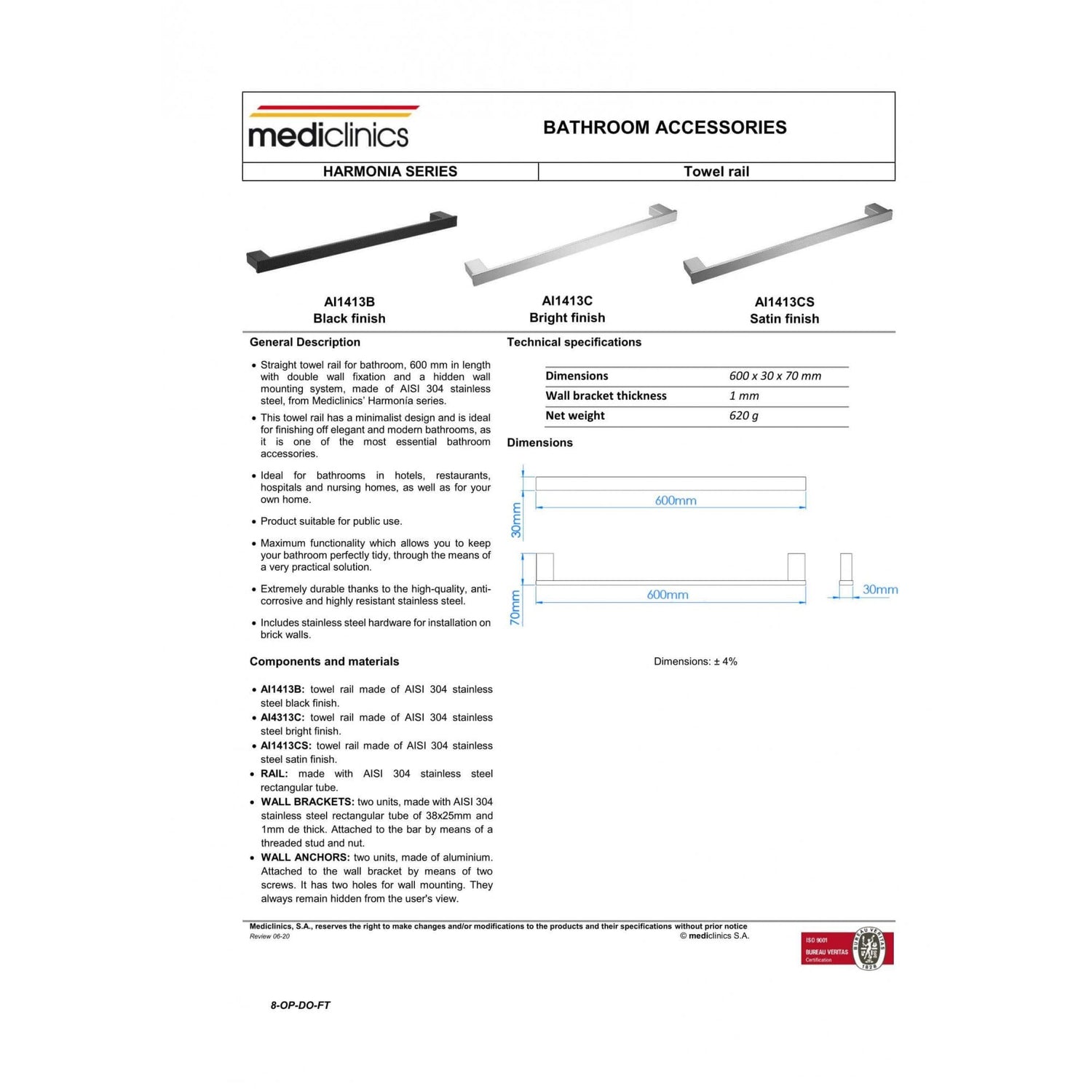 The straight towel rail is perfect for all public or private bathrooms with a sleek and elegant design. Made from stainless steel this rail features a hidden wall mount design and is very durable being anti-corrosive and highly resistant. This 600mm rail is double mounted and the hardware for the installation is provided.