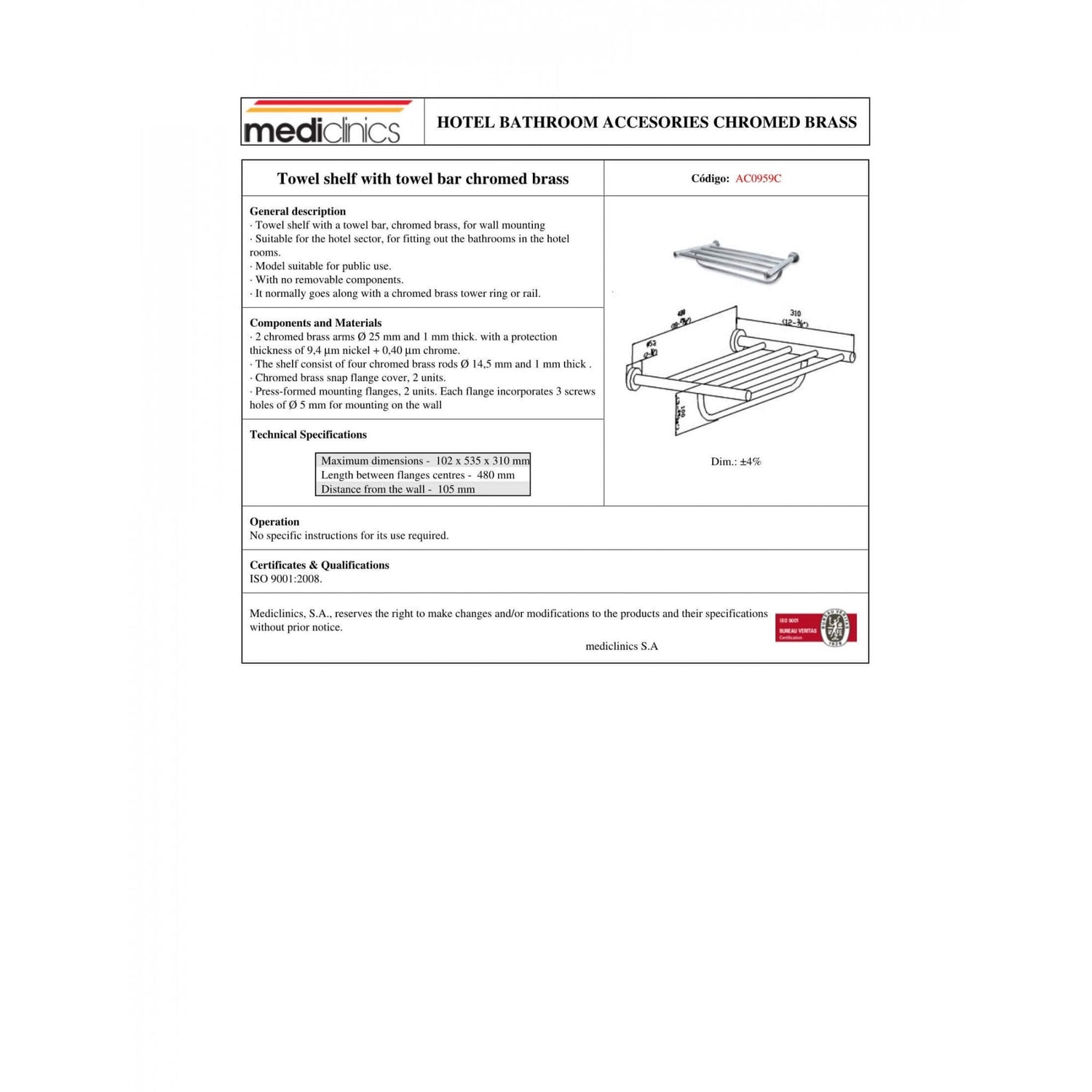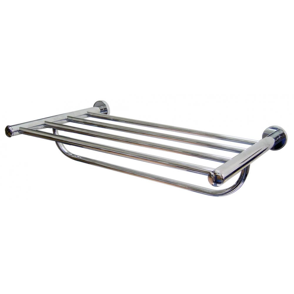 This towel shelf with rail is made of chrome plated brass and is to be wall mounted in public or private settings such as hotel bathrooms. A suitable option for storing and hanging towels there are no removable components. This product usually goes alongside a chrome brass towel ring or rail.
