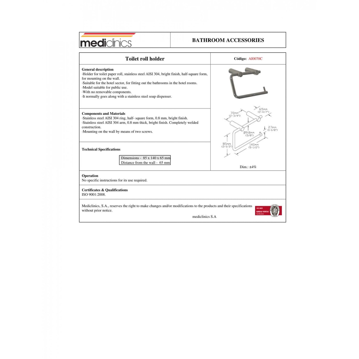 This quality wall mounted stainless steel toilet roll holder from the Mediclinics Medinox Range can hold one standard sized toilet roll and is available in both a polished chrome or satin steel finish. It is manufactured from quality AISI 304 Stainless Steel, ensuring a durable product which will resist both rust and corrosion making it ideal for public installation. All parts including the two supports are also made from AISI 304 stainless steel, and with no removable parts, this toilet roll holder is easy to install using the appropriate screws and plugs provided. Easily maintained using soap and warm water, using a soft cloth to clean.