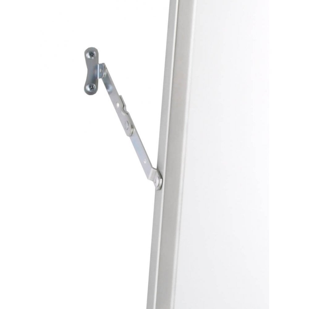 The 6mm silvered glass mirror has polished edges with plastic filler strips. A polyethylene padding protects its back. The 19x19mm stainless steel unibody frame is holded tightly against the mirror by an also elegant bevelled design on front. At the same time, fastened to the frame with concealed fixings, there is a galvanised back with a piano-hinge at the bottom and, riveted, two heavy-gauge plated-steel folding support brackets that lock the unit in upright or forward tilt position.
