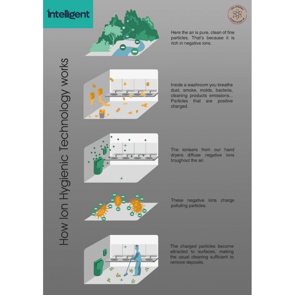Before the air reaches your hands, it has to pass through a HEPA filter medium that includes a pre layer and carbon filter to make sure it catches 99.9% bacteria, leaving a superior air quality to dry with. The ioniser users Ion Hygienic technology that cleans and purifies the air in the washroom through the emission of anions, eliminating most germs and particles transported through the air. Odour neutraliser’s can be purchased to further help rid the bathroom of unwanted aromas.