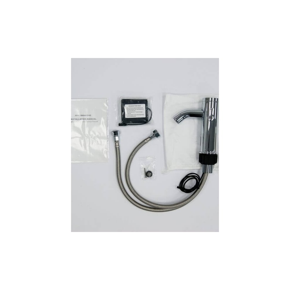 This sensor tap comes with four 1.5V AA batteries (not furnished). Please note that, like all tapware, the faucet needs frequent cleaning of its filters. We would also encourage you to disinfect the internal parts once in a while. Beware that infrared sensors may make mistakes if other sensors or reflective surfaces are in their detection range. It is extremely important to follow the installation instructions provided in the box.