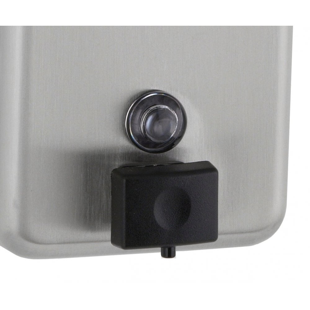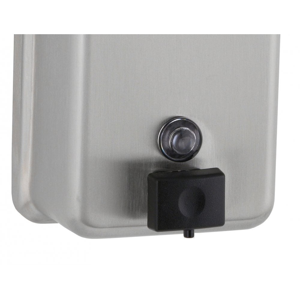 Very resistant to corrosion, with great capacity and in a prestige finish, B-2111 vertical soap dispenser is ideal for high traffic commercial washrooms with a contemporary décor. Quite straightforward to maintain, one can check the soap level on its acrylic indicator window and refill its 1.2 litre reservoir capacity by opening the hinged top lid, which requires a special key (furnished). It is also simple to use: the black push button of B-2111 dispenses up to 0.66ml each time. And since only one hand and less than 22.2N of force are needed to operate the valve, this soap dispenser is suitable for accessible washrooms.