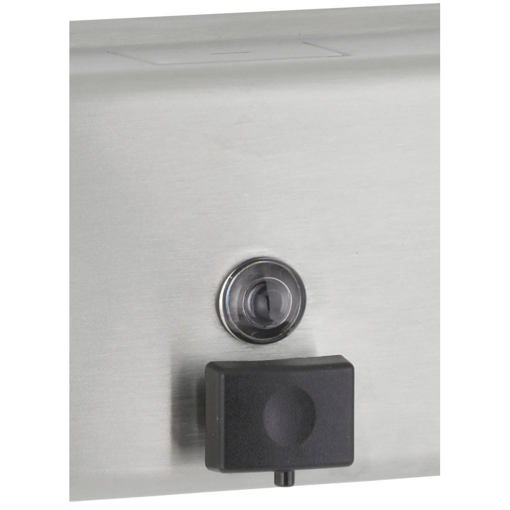 This horizontal soap dispenser has been designed by Bobrick to be surface-mounted. One hand can simply operate the valve, needing less than 22.2N of force, so this liquid soap dispenser can be placed in accessible toilets. Stainless steel in brushed finish is the long-lasting material of the container and the concealed back plate. Its reservoir can store up to 1.2 litre, dispensing 0.66ml with each touch on its black plastic push button. An acrylic window allows to check the soap level. To refill B-2112, just use the special key (furnished) to open the top lid.