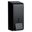 This refillable soap dispenser is manufactured from a zinc coated steel and complete with a contemporary matte black powder coat finish.