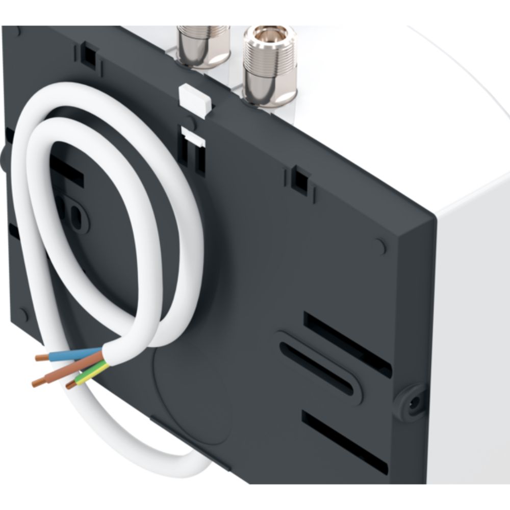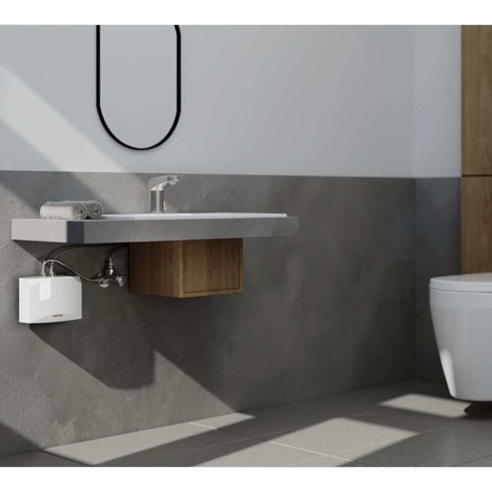 Mini instantaneous water heater with closed-loop control, control electronics, outlet temperature sensor and variable flow rate limitation. Accurate temperature delivery up to the maximum output. Internal temperature limiting. Includes special aerator for perfect water flow pattern and integral flow controller for use in existing taps. Anti-scalding protection for high inlet temperatures via automatic output matching.