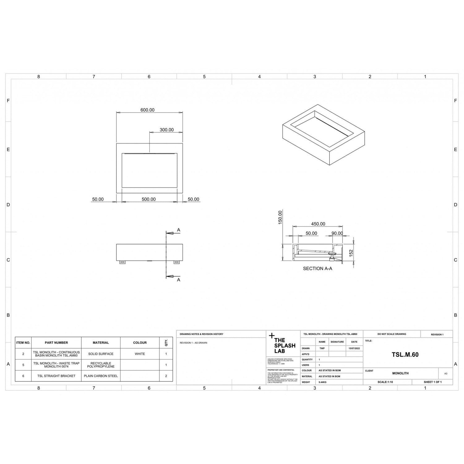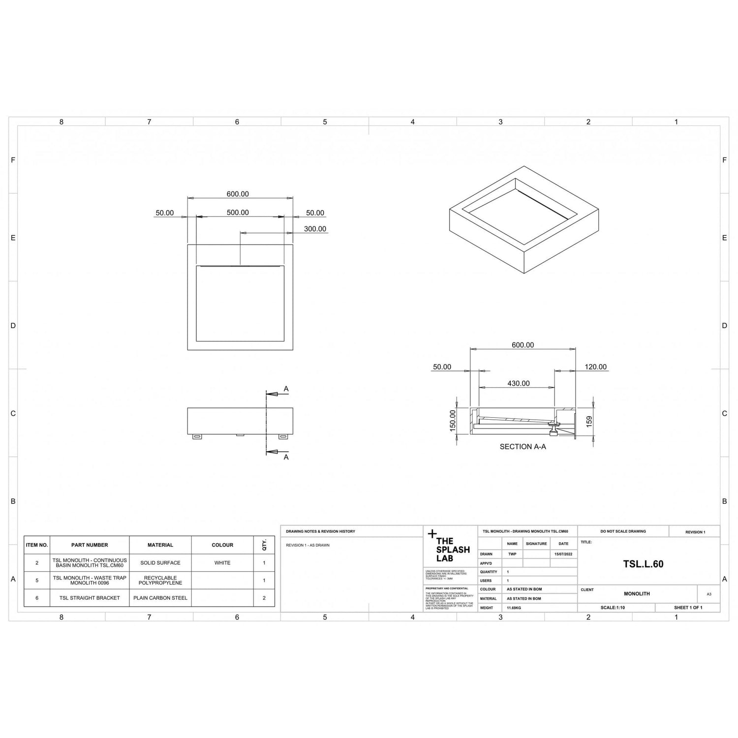 The Monolith S, M or L Series Wall Mounted Wash Basin L.600mm (300, 450 or 600mm Depth)