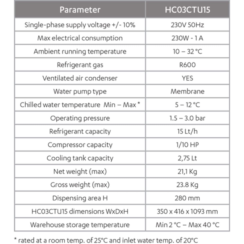 HydroChill HC03 floor standing 15ltr chilled & ambient filtered water dispense with push button controls for ease of use. Featuring matt black design, carbon block taste & odour filter and sterilising UV out filtration at point of dispense; kills bacteria, viruses, moulds, algea.