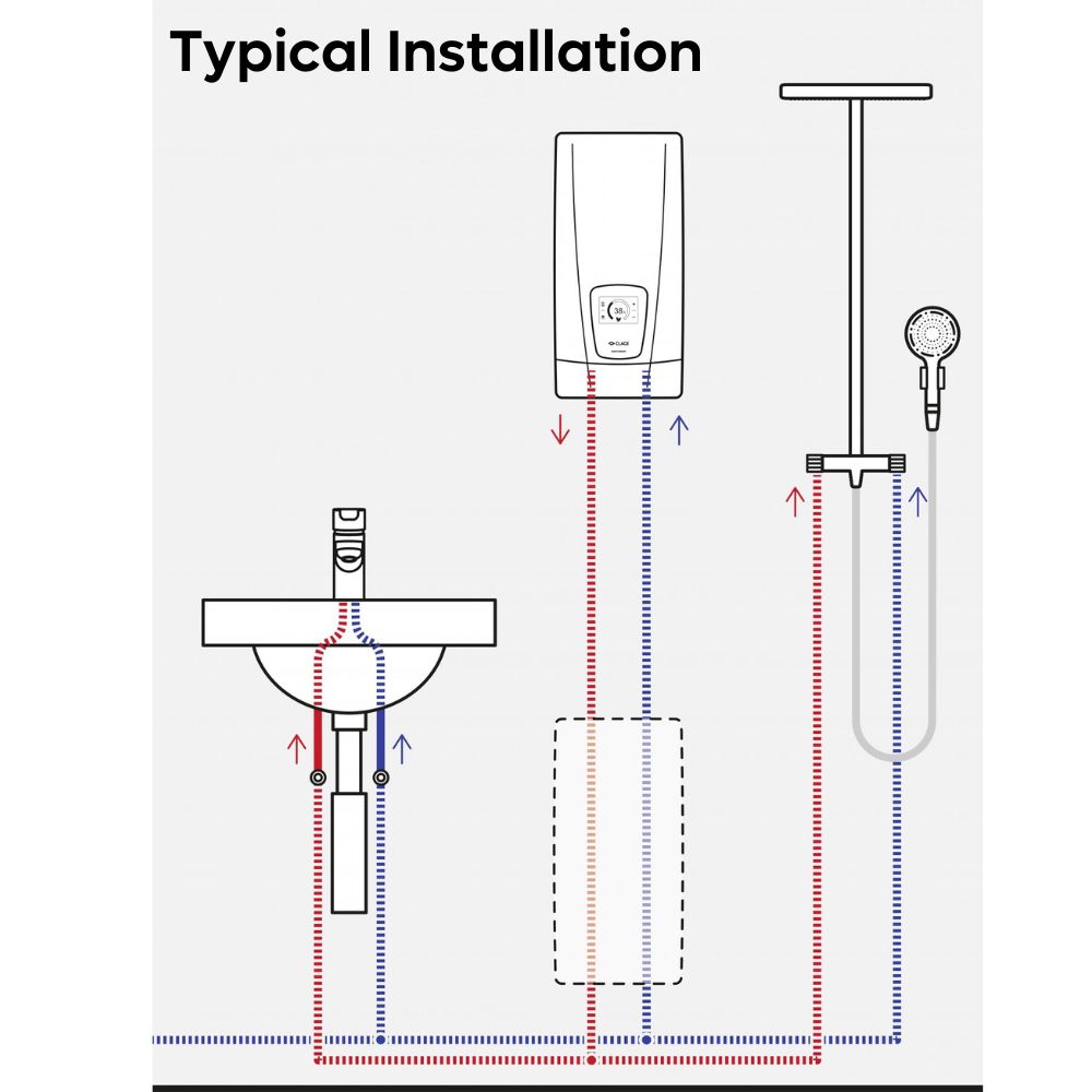 The appliance is intended for connection to a wholesome water supply. The specific water resistance of the supply must not fall below the minimum specified on the rating plate. Hot and cold connecting pipes should be WRAS approved and of copper or steel construction. Plastic pipes may only be used if conforming to DIN 16893 Series 2. The hot water pipes must be thermally insulated. Minimum flow rate 1.5 litres/min.  Should be installed by a suitably qualified installer of electric instantaneous water heaters.