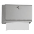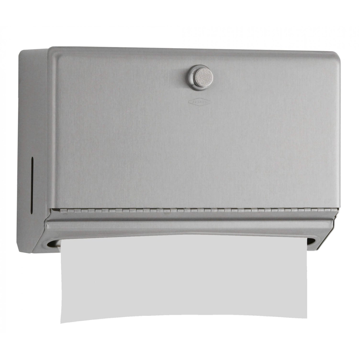 Bobrick B-2621 is a slimline stainless steel dispenser with only 10cm of depth and 18cm of height that has capacity for up to 200 c-fold or 275 multifold hand paper towels, being suitable for low traffic washrooms like offices. The cabinet towel tray comes with hemmed opening to avoid tearing and one slot at the side of the product allowing to check when the product is half full or almost empty. Should you wish to save paper ensuring only paper towel is dispensed at a time, this mini paper towel dispenser is compatible with TowelMate®, an accessory that also prevents paper from sagging or bulging and works as an adapter for narrower paper towels.