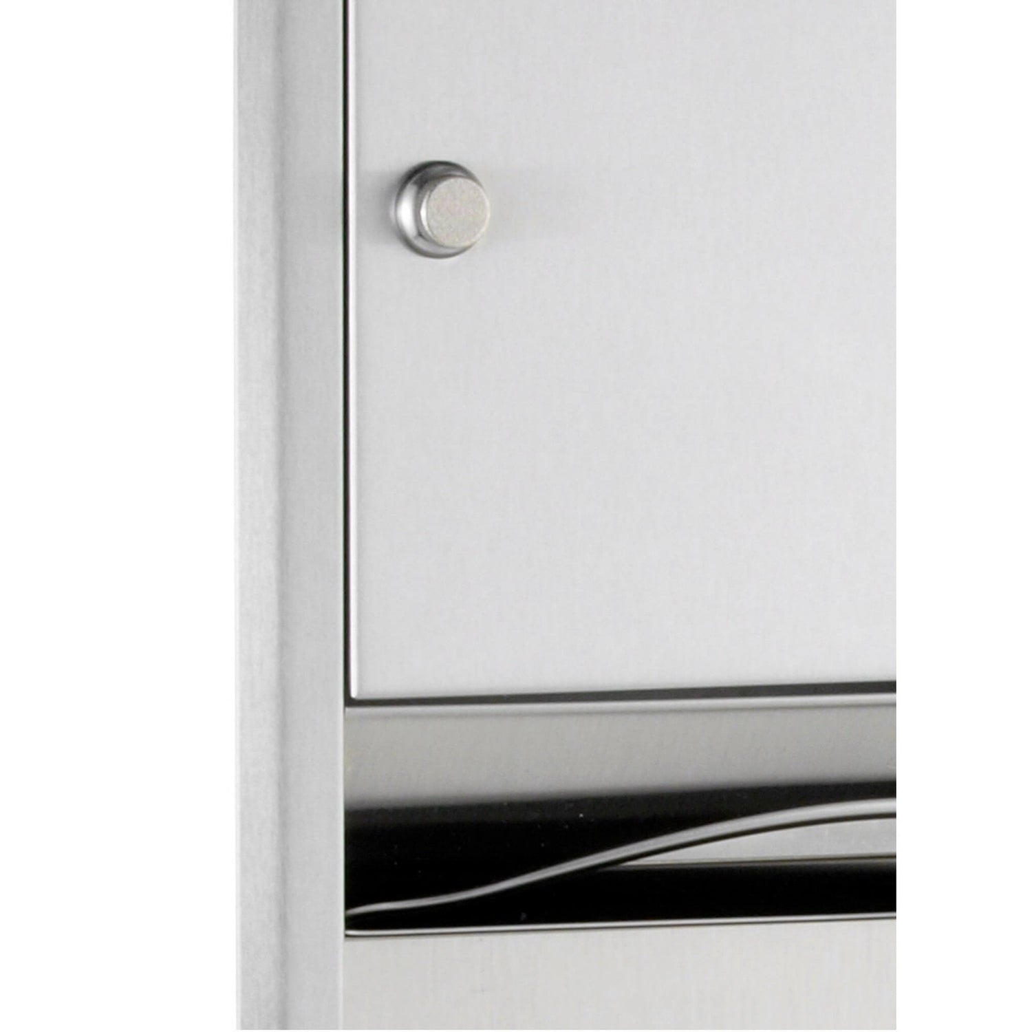 Bobrick B-369 is a recessed hand drying combination unit that consists of a paper towel dispenser for multifold or C-fold sheets and a waste receptacle right underneath to maintain the washroom clean. Secured to the all-welded cabinet, the hinged door is equipped with a knob latch. Unlike some models in the market, this hand towel dispenser does not need any adapter to operate. In order to dispense one paper towel at a time properly, without usual troubles such as sagging or bulging, TowelMate® can be used as an accessory. The waste bin comes with hemmed top edges for safe servicing and retaining hook. Inside, a 7.6L leak-proof plastic container that is removable. The whole unit is finished by a drawn, bevelled flange as well as the elegant, solid lines typical of the ClassicSeries. Its design and 304 stainless steel manufacture ensures vandal resistance and durability.