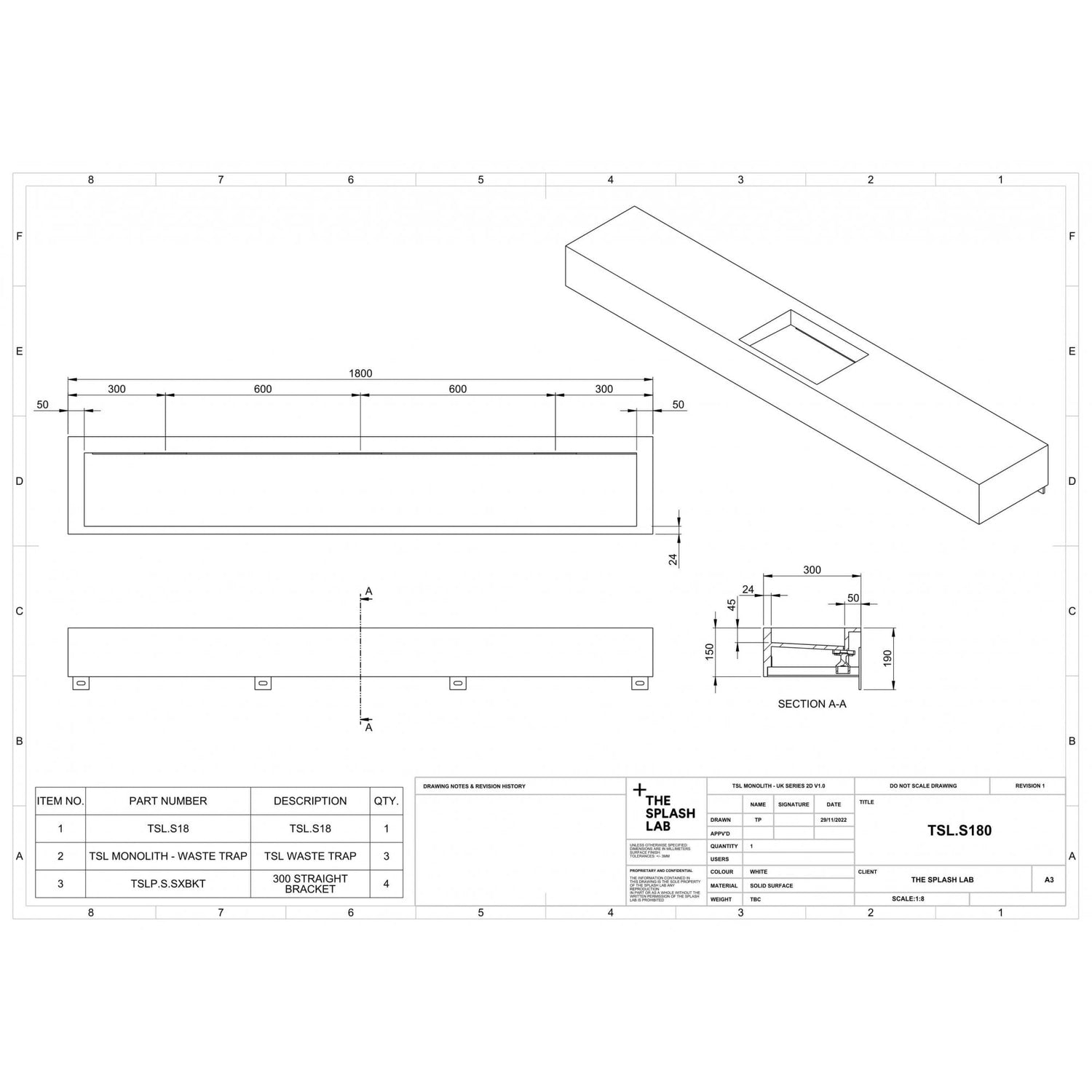 • Dimensions: 1800(W) x 300, 450 or 600(D) x 150(H) mm