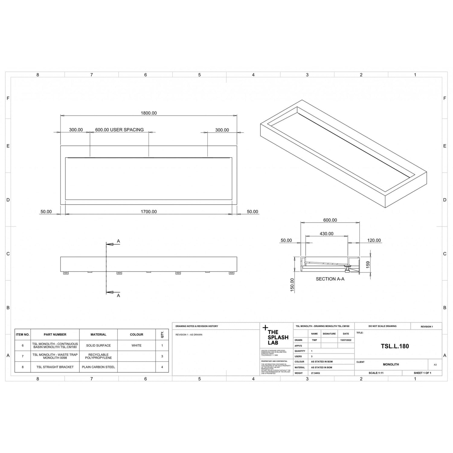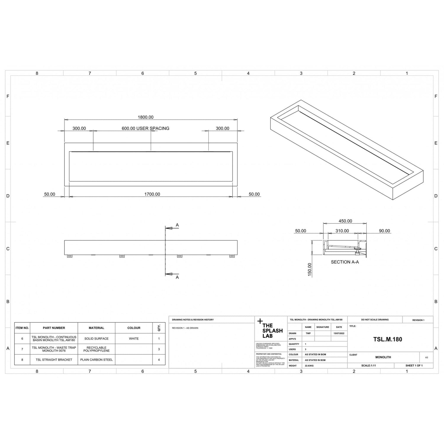 The Monolith S, M or L Series Wall Mounted Wash Basin L.1800mm (300, 450 or 600mm Depth)