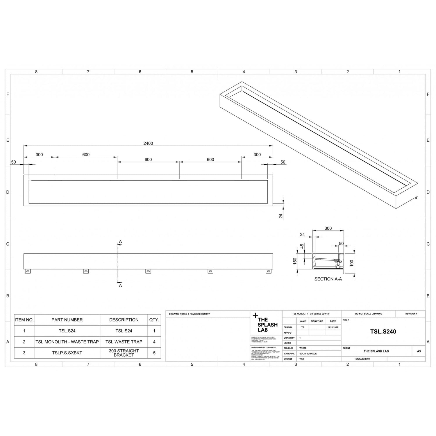 • Dimensions: 2400(W) x 300, 450 or 600(D) x 150(H) mm