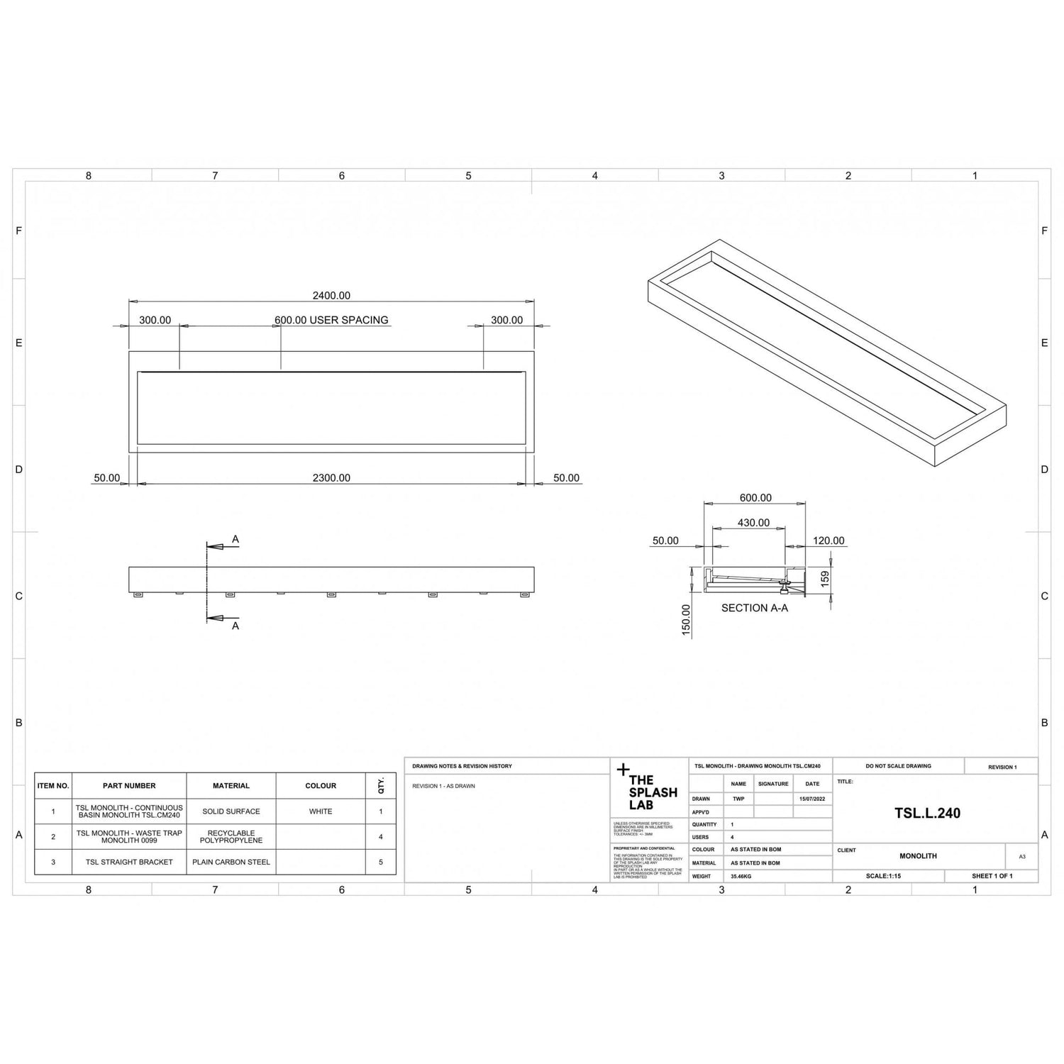 The Monolith S, M or L Series Wall Mounted Wash Basin L.2400mm (300, 450 or 600mm Depth)