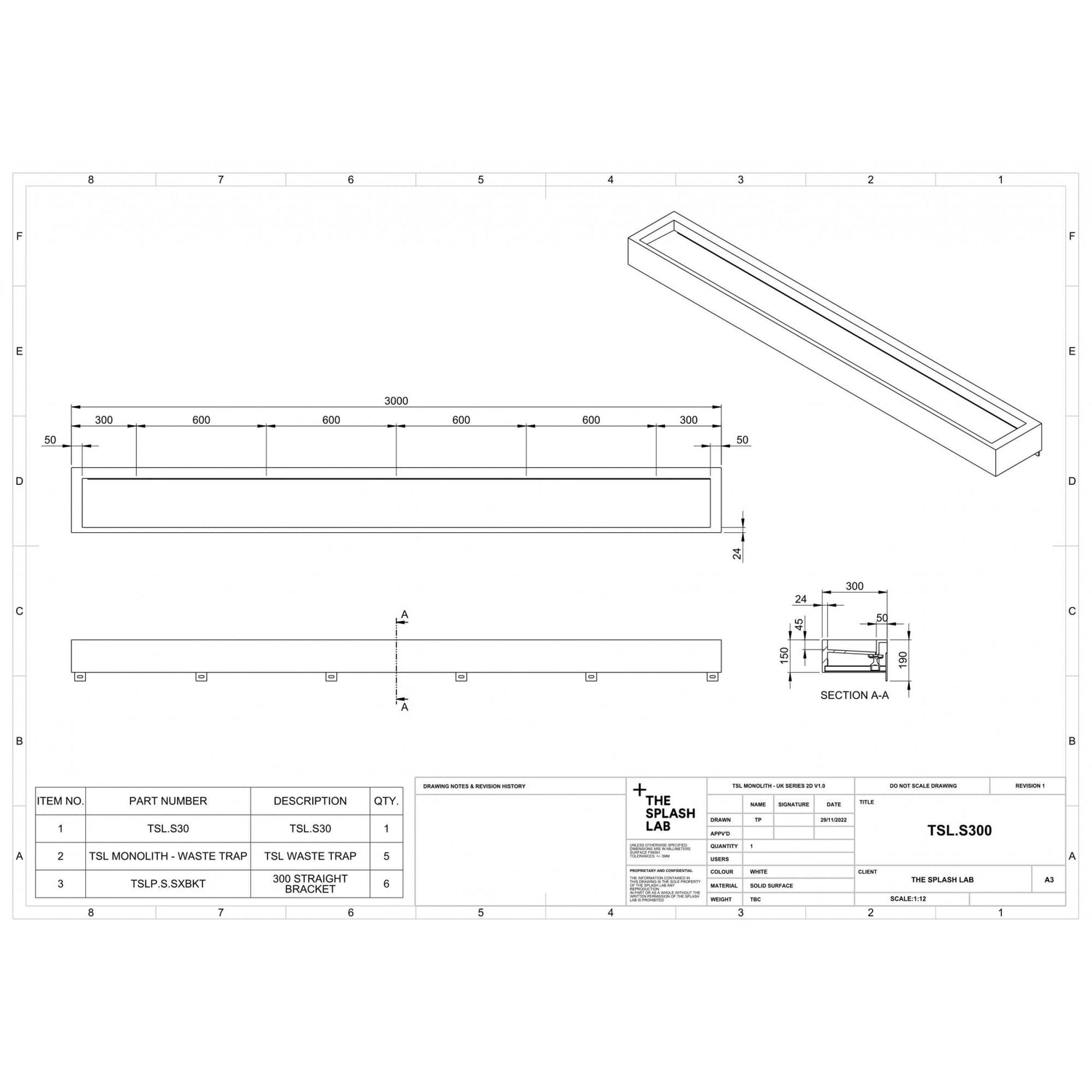 - Dimensions: 3000(W) x 300, 450 or 600(D) x 150(H) mm