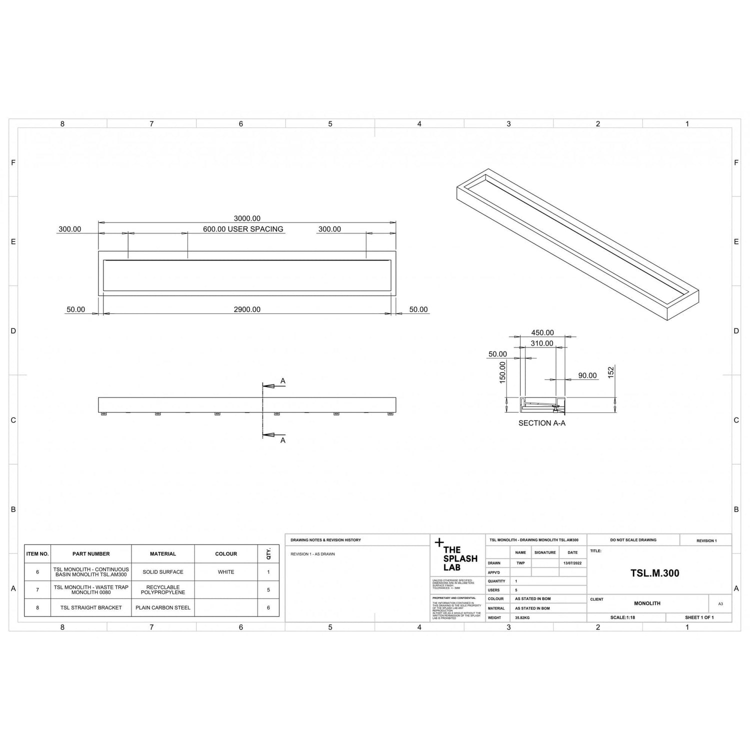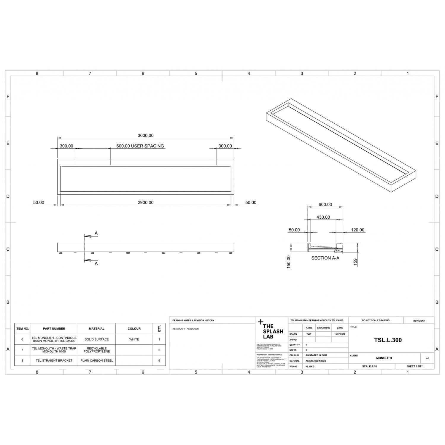 The Monolith S, M or L Series Wall Mounted Wash Basin L.3000mm (300, 450 or 600mm Depth)