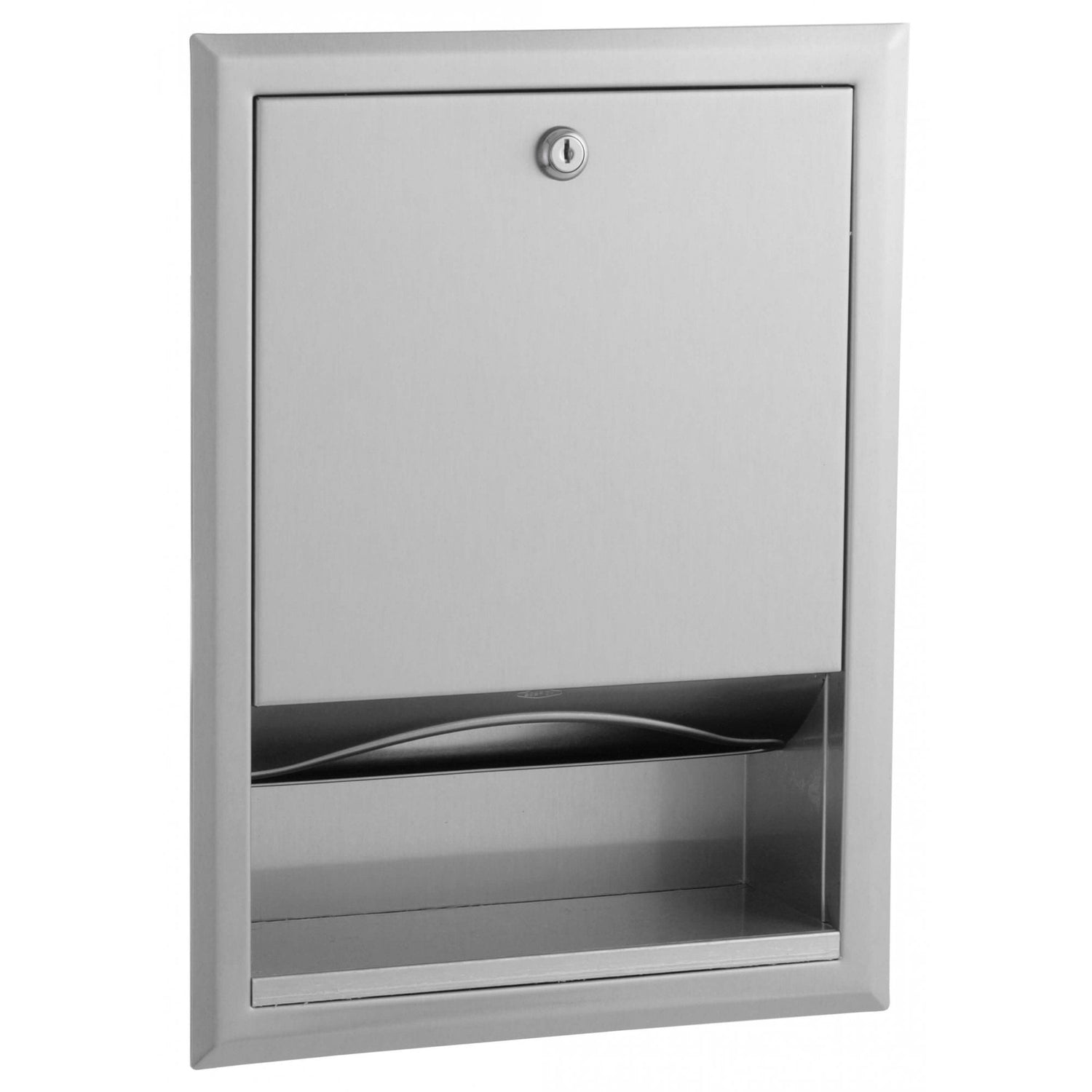 Bobrick B-359 recessed paper towel dispenser is designed to save space at medium traffic contemporary washrooms without giving up on durability and quick maintenance. With all parts made of stainless steel, the unit is protected by a welded cabinet, a seamless flange and a warp-resistant hinged door with swing limiter. One can directly replenish the dispenser with C-fold or multifold paper towels, not requiring any adapters or adjustments. As an antivandal measure, the item comes with a keyed front, whose lock is the same as other Bobrick accessories for an added convenience.