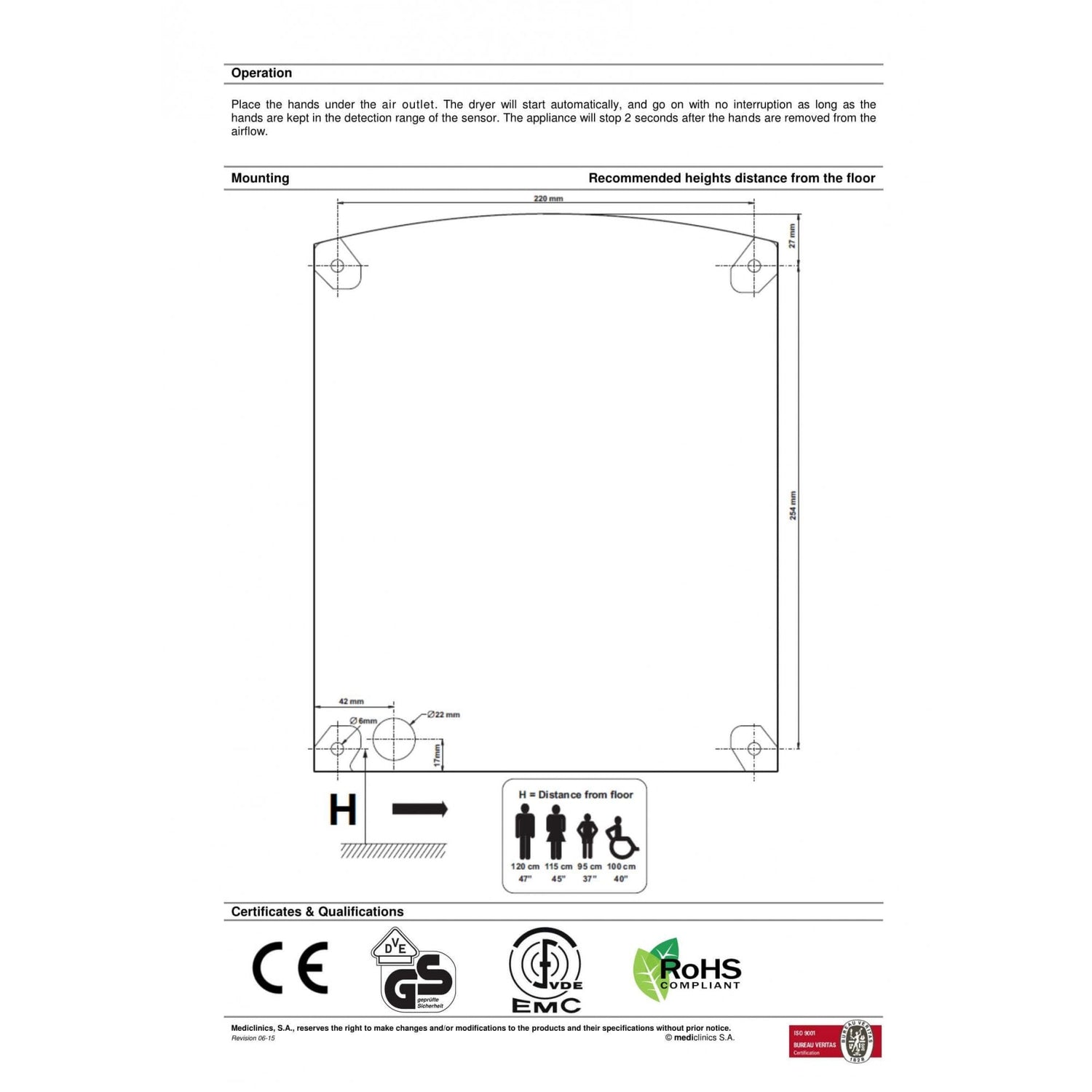 Mediclinics Juniorplus M88APlus hand dryers is a unit that has been built with value for money in mind. Equipped with a one piece ABS resistant cover, with a modern design. These are suitable for small washrooms. This model includes an electronic detection system that uses an infrared beam, which is an adjustable mechanism that allows better adaptability to different types of washrooms. They are ideal to be installed in washrooms in places like restaurants, theatres, offices, where there is under 50 uses per day. These dryers also provide maximum safety, with a safety thermal cut off installed in the motor and another one in the dryer's heating element.