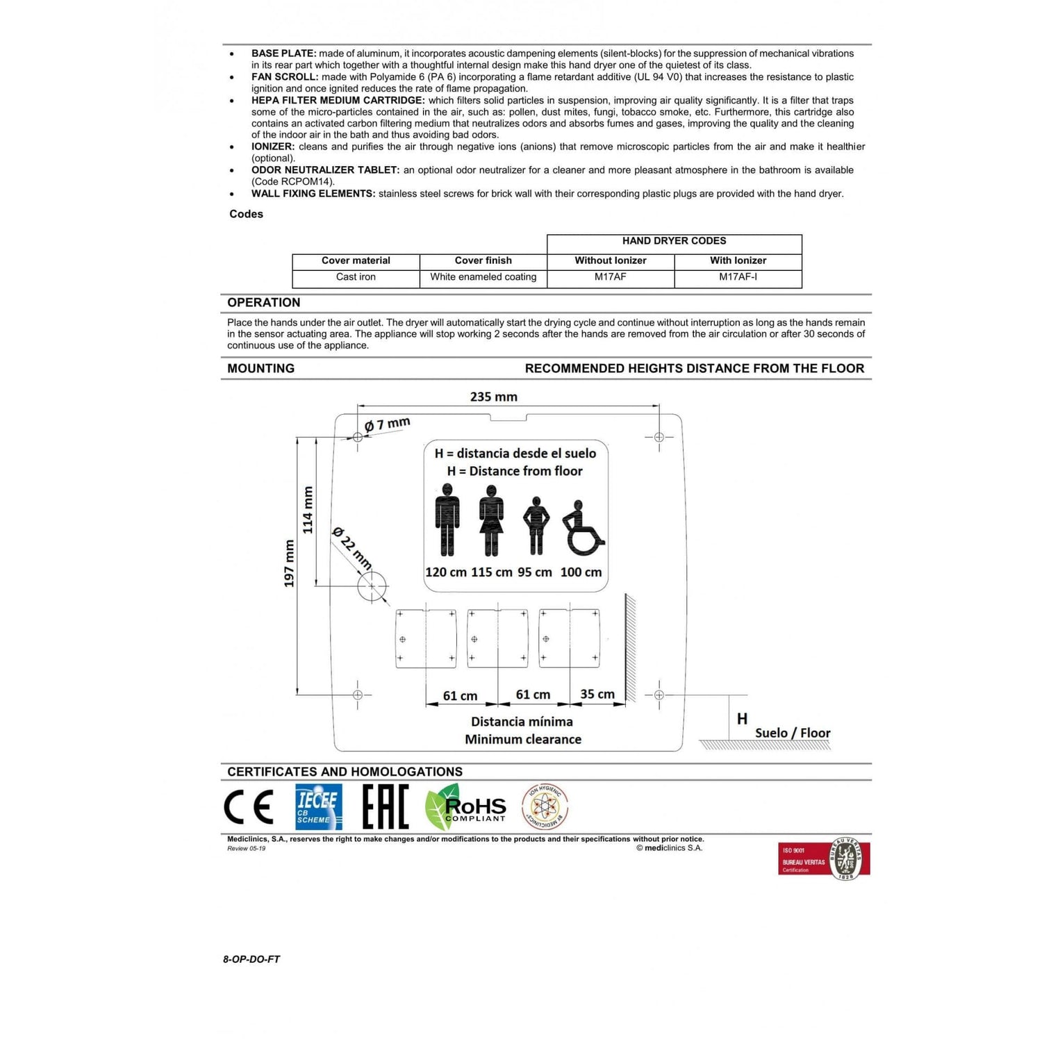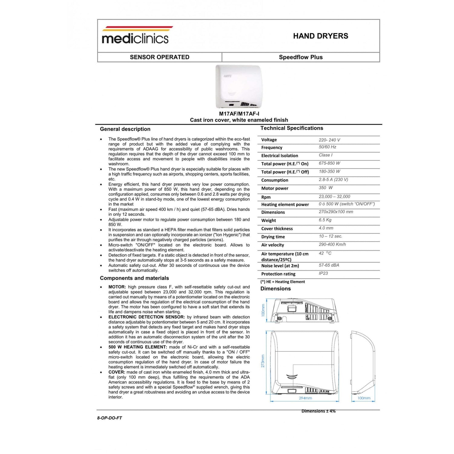 The Mediclinics Speedflow Plus is one of the most energy efficient hand dryers available with the ability to run the unit at just 180W rated power, whilst only reaching 850W at maximum settings. Not only that, it complies with the ADAAG accessibility for public washrooms requirements as it has a depth of just 10cm. Whilst being relatively low noise, it still has a manufacturer stated dry time of 10-12 seconds which means users won’t be hanging around to get their hands dry, ensuring traffic moves quickly through the washroom. A HEPA filter is included as standard which filters solid particles in suspension, improving air quality significantly. It’s a filter that traps some of the micro-particles contained in the air, such as: pollen, dust mites, fungi, etc. Furthermore, this cartridge also contains an activated carbon filtering medium that neutralizes odours and absorbs fumes and gases.