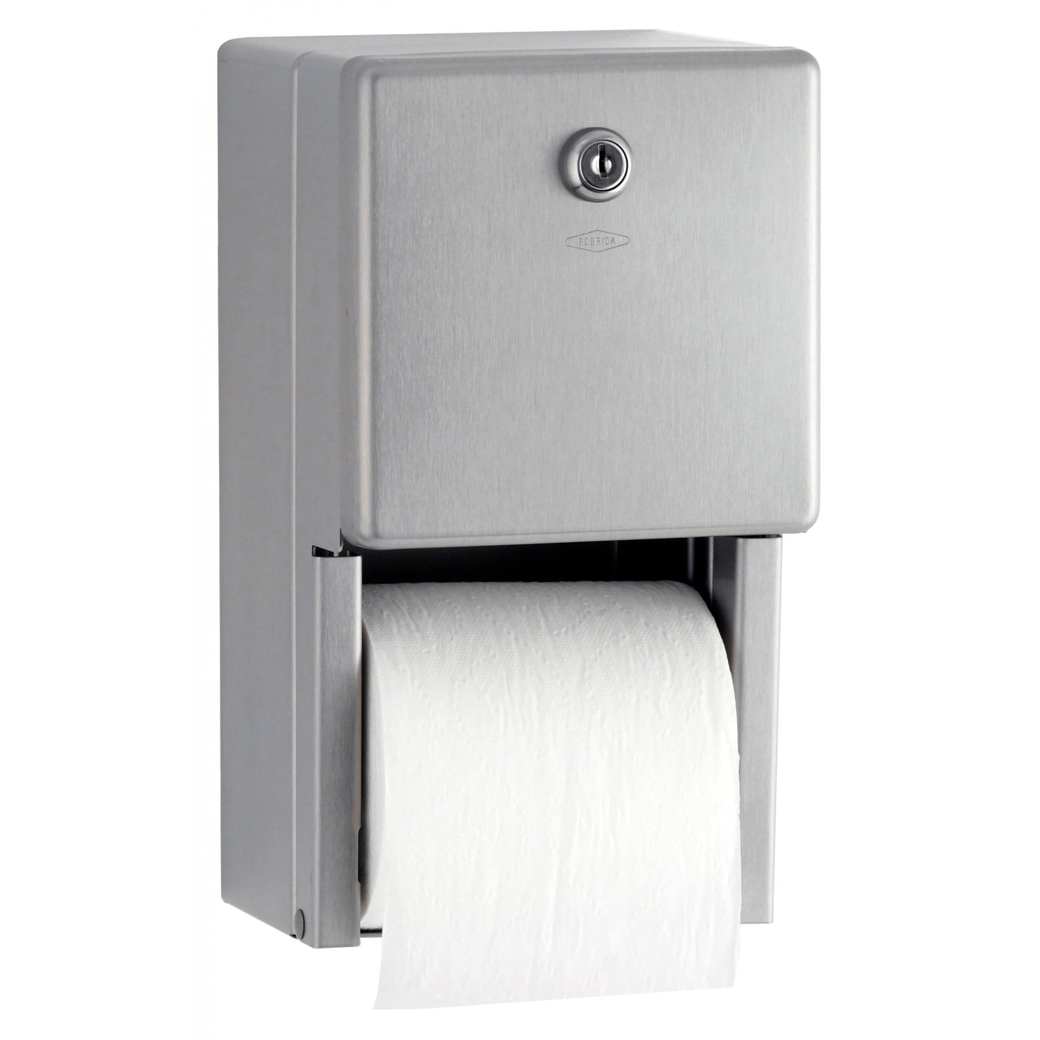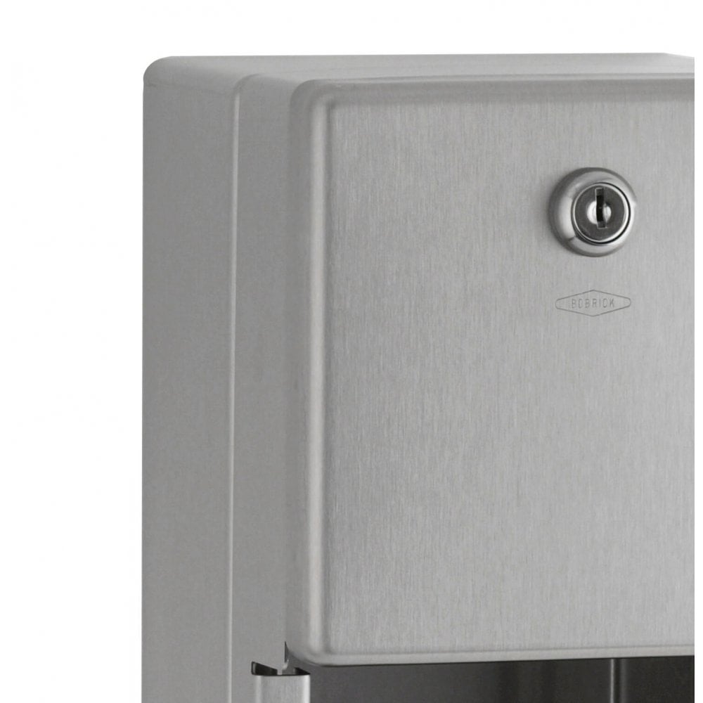 Le distributeur de papier toilette double Bobrick B-2888 est un support monté en surface remarquablement résistant au vandalisme pour les rouleaux de mandrin standard jusqu'à 135 mm de diamètre. L'armoire, le système de distribution, le boîtier, la came, la porte verrouillable à clé et son cadre sont en acier inoxydable 304 durable, tandis que les deux broches en ABS sont robustes et résistantes au vol (retenues par le mécanisme tant que la porte est verrouillée). La face avant plate de ce double support a une construction sans couture. Sa finition satinée se distingue par son choix neutre, résistant et élégant, facile à assortir. Le second se mettra en place une fois le premier épuisé, bien que la porte doive être déverrouillée pour retirer et charger les rouleaux.