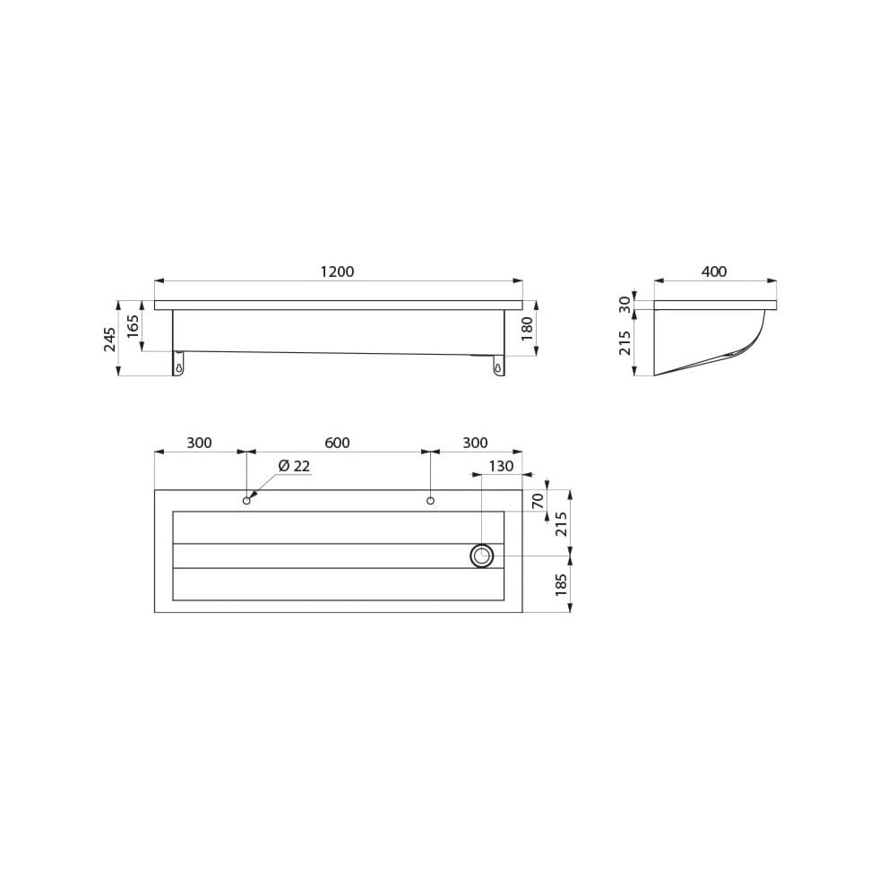 CANAL Lavabo Mural Inox L.1200 avec 2 Trous Robinetterie Ø22mm 121250