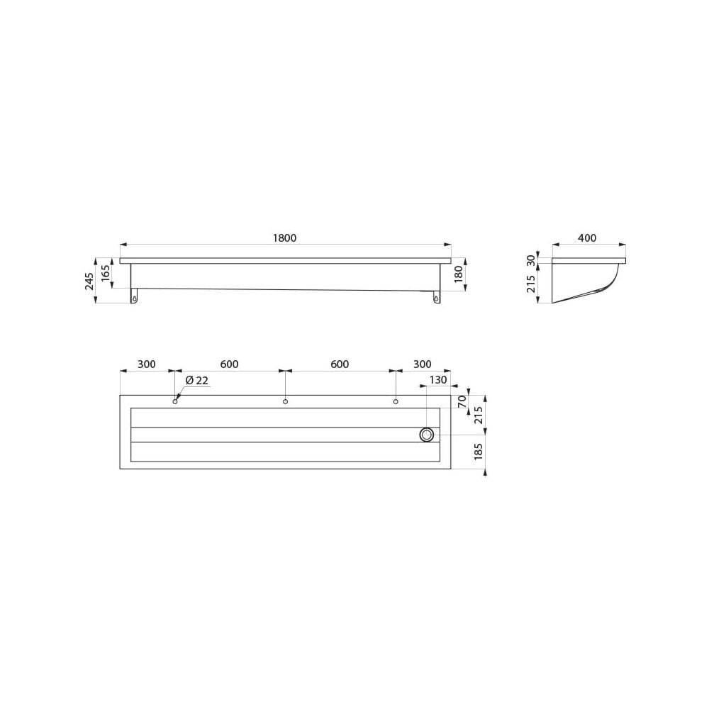 CANAL Lavabo Mural Inox L.1800 avec 3 Trous Robinetterie Ø22mm 121280