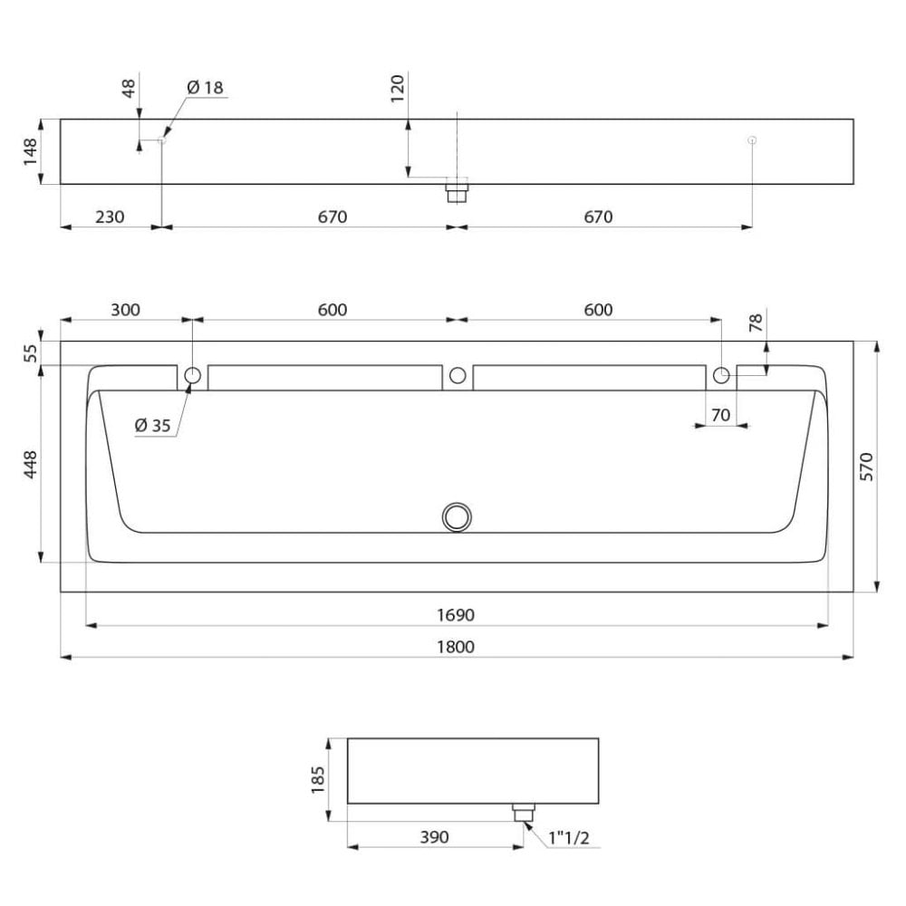 Lavabo mural MINERALCAST L.1800 avec 3 trous de robinetterie Ø35 mm 454182