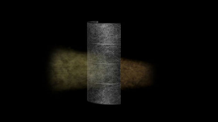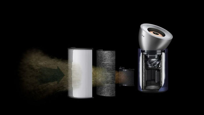 La filtration avancée en trois étapes comprend des filtres HEPA H13, au charbon actif et à oxydation catalytique sélective. Le filtre HEPA H13 repensé de Dyson contient 21 mètres de microfibres borosilicates, plissées plus de 450 fois. Il capture 99,95 % des particules microscopiques mesurant jusqu'à 0,1 micron.⁶