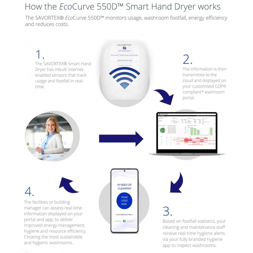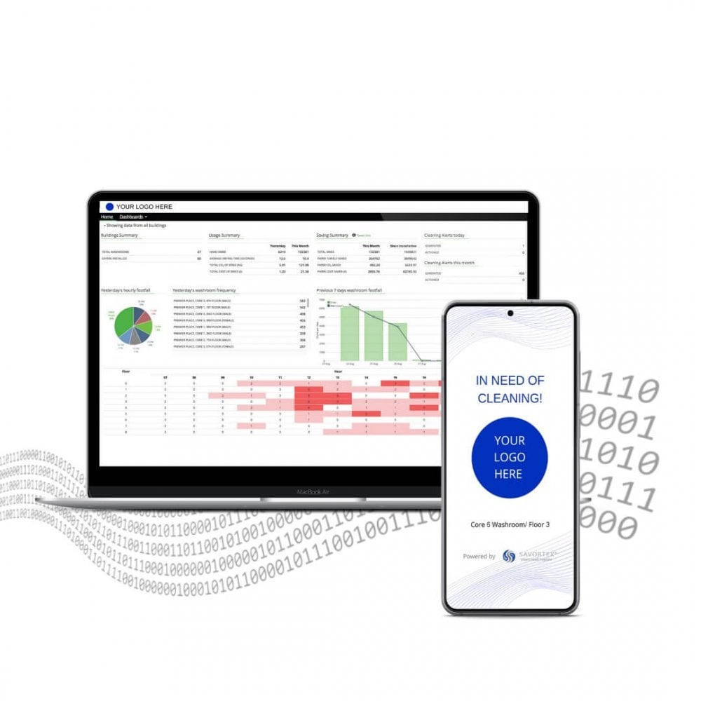 The smart hand dryer alerts cleaners via your fully branded SAVORTEX® Washroom App* to inspect washrooms based on actual footfall metrics improving hygiene and resource efficiency, and reducing customer complaints of messy washrooms. With access available to your customisable online washroom portal, you get to see real-time washroom usage, cleaning analytics to help you drive the cleanest most sustainable washrooms.