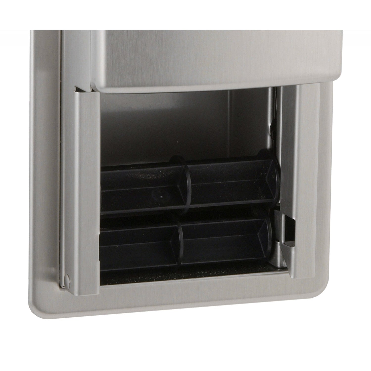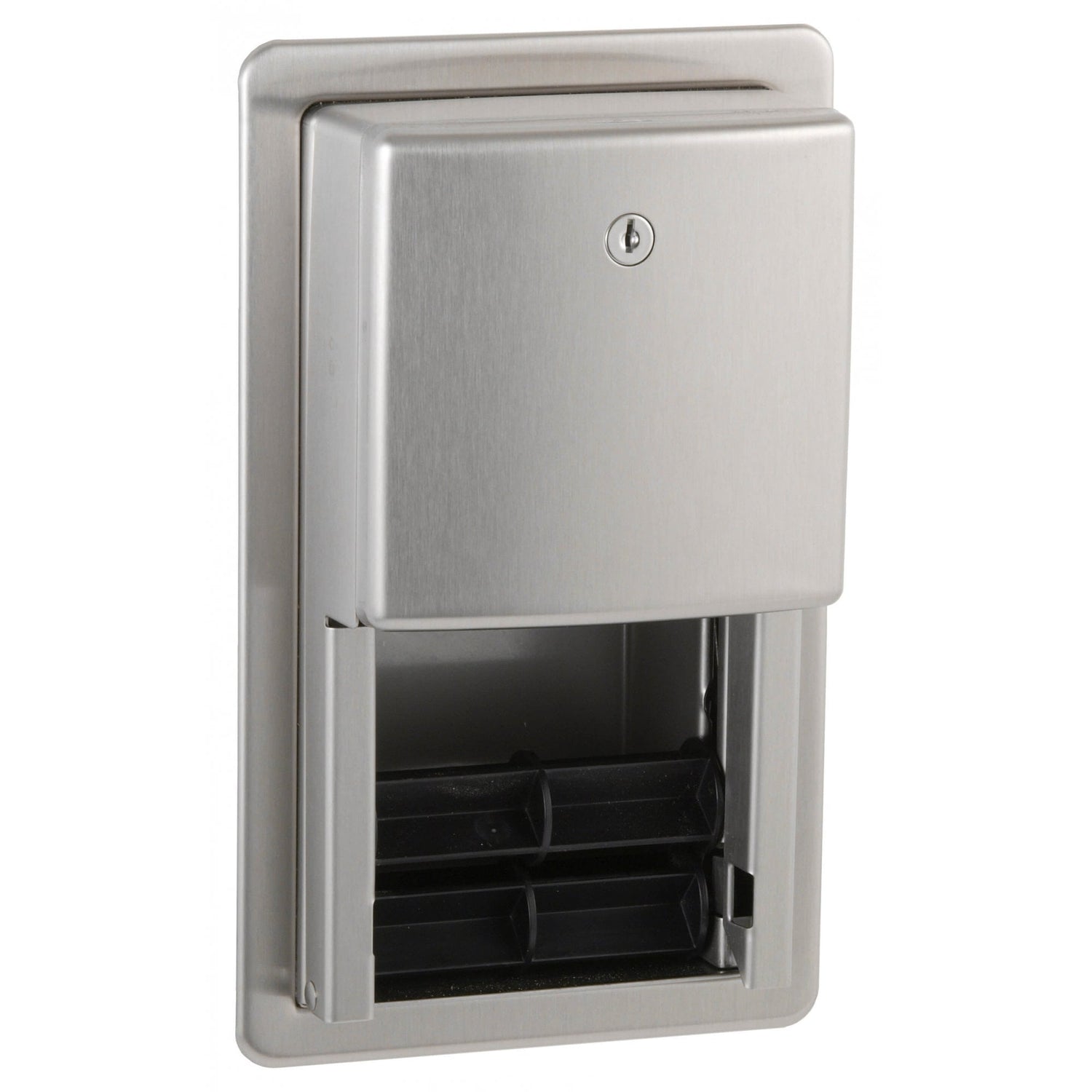Portarotolo doppio B-4388 con design per montaggio ad incasso a parete consente di risparmiare spazio, richiede poca manutenzione grazie alla caduta automatica del secondo rotolo e garantisce durata. Numerose caratteristiche rendono possibile la resistenza e l'antivandalismo: porta con serratura, mandrini antifurto per carichi pesanti e un armadio in acciaio inossidabile 304 con finitura curvata satinata che si adatta a qualsiasi bagno di prestigio.