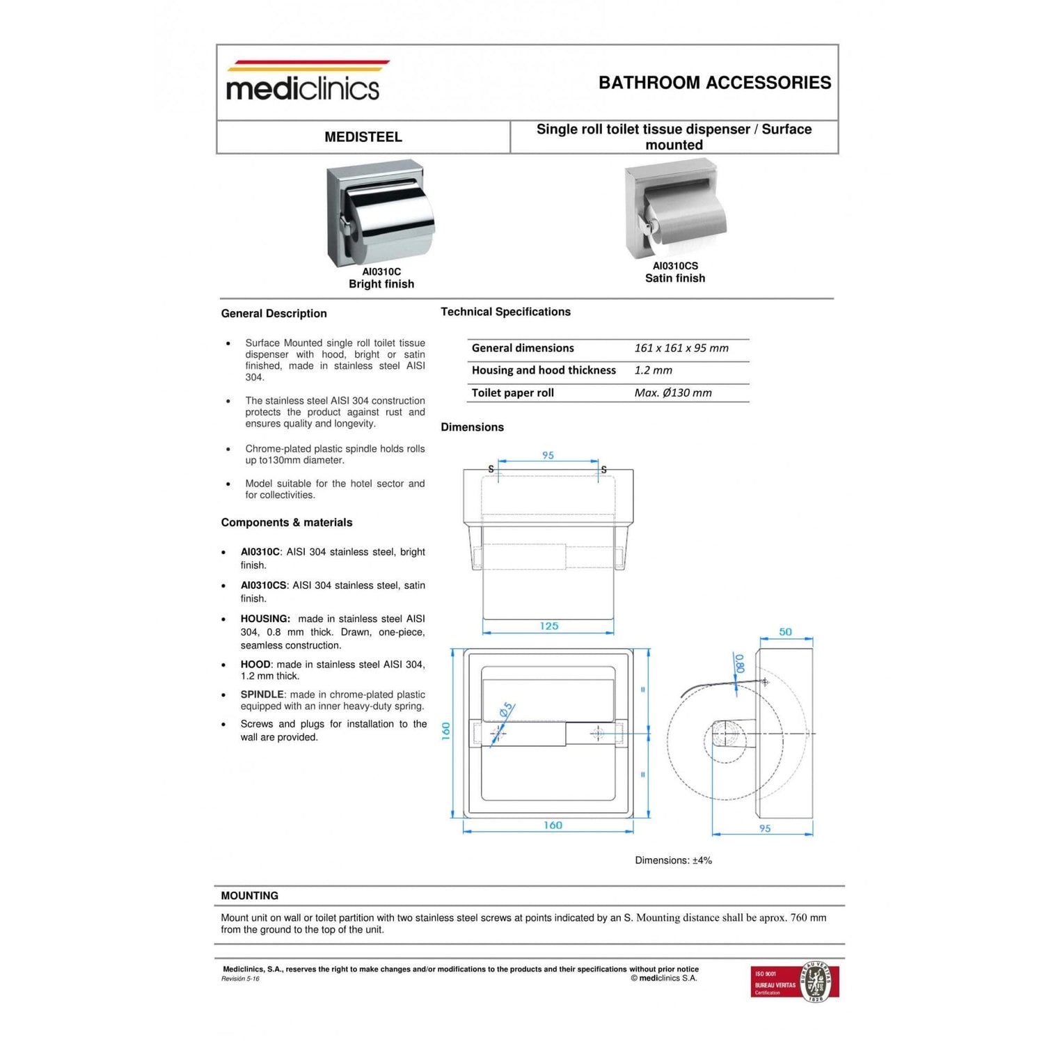 Il portarotolo singolo con coperchio è un supporto da parete realizzato in acciaio inossidabile che previene ruggine e corrosione garantendo un prodotto di qualità. Il corpo ha uno spessore di 0,8 mm, mentre la copertura ha uno spessore di 1,2 mm. Il mandrino cromato è dotato di una molla interna per carichi pesanti, in grado di sostenere rotoli fino a 130 mm di diametro. È adatto a qualsiasi locale pubblico con ferramenta prevista per l'installazione a parete.