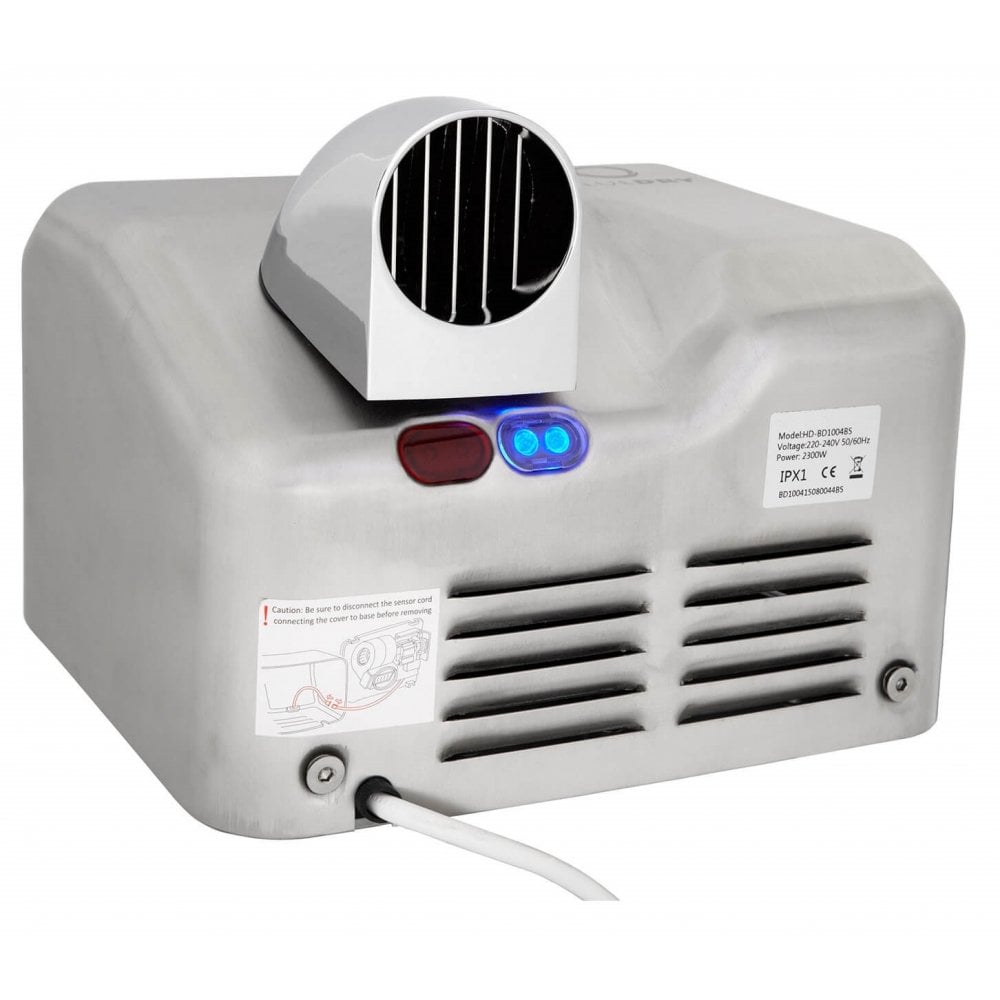 Il Blue Dry Blue Storm è un asciuga mani dall'aspetto tradizionale, ad attivazione automatica che consente a un ugello rotante a 360 gradi di asciugare non solo le mani, ma anche il viso, se necessario. La copertura è stata realizzata in acciaio inossidabile 304 e la sua solida struttura la rende un'unità adatta in caso di atti vandalici. Un asciuga mani silenzioso è supportato dal fatto che l'asciugamani è progettato con riduzione delle vibrazioni nello strato di base. Un futuristico raggio di luce blu guida l'utente verso il flusso d'aria per migliorare i tempi di asciugatura.