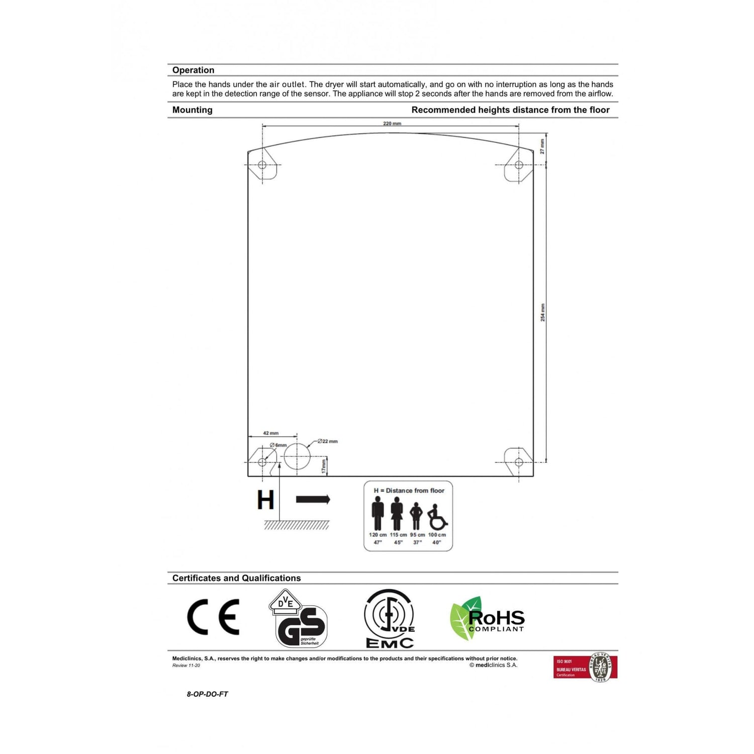 Gli asciugamani Mediclinics Optima sono ideali per essere installati in bagni con poco traffico quotidiano come ad esempio ristoranti, teatri, uffici, ecc. Questo modello è simile nelle specifiche al Mediclinics Juniorplus, tuttavia M99 ha il vantaggio aggiuntivo di un acciaio inossidabile copertura in acciaio che ne aumenta la durata. Inoltre è dotato di caratteristiche antivandalismo, come l'integrazione di viti di sicurezza e uno speciale apriporta. Sono azionati da un sensore a infrarossi regolabile e sono dotati di un motore a induzione che non richiede alcuna manutenzione. Questi asciugamani si abbinano a qualsiasi arredamento del bagno poiché sono disponibili in tre diverse finiture; acciaio bianco, acciaio inossidabile AISI 304 finitura satinata e acciaio inossidabile AISI 304 finitura lucida. Questi essiccatori garantiscono inoltre la massima sicurezza, con un interruttore termico di sicurezza installato nel motore e un altro nell'elemento riscaldante dell'essiccatore.